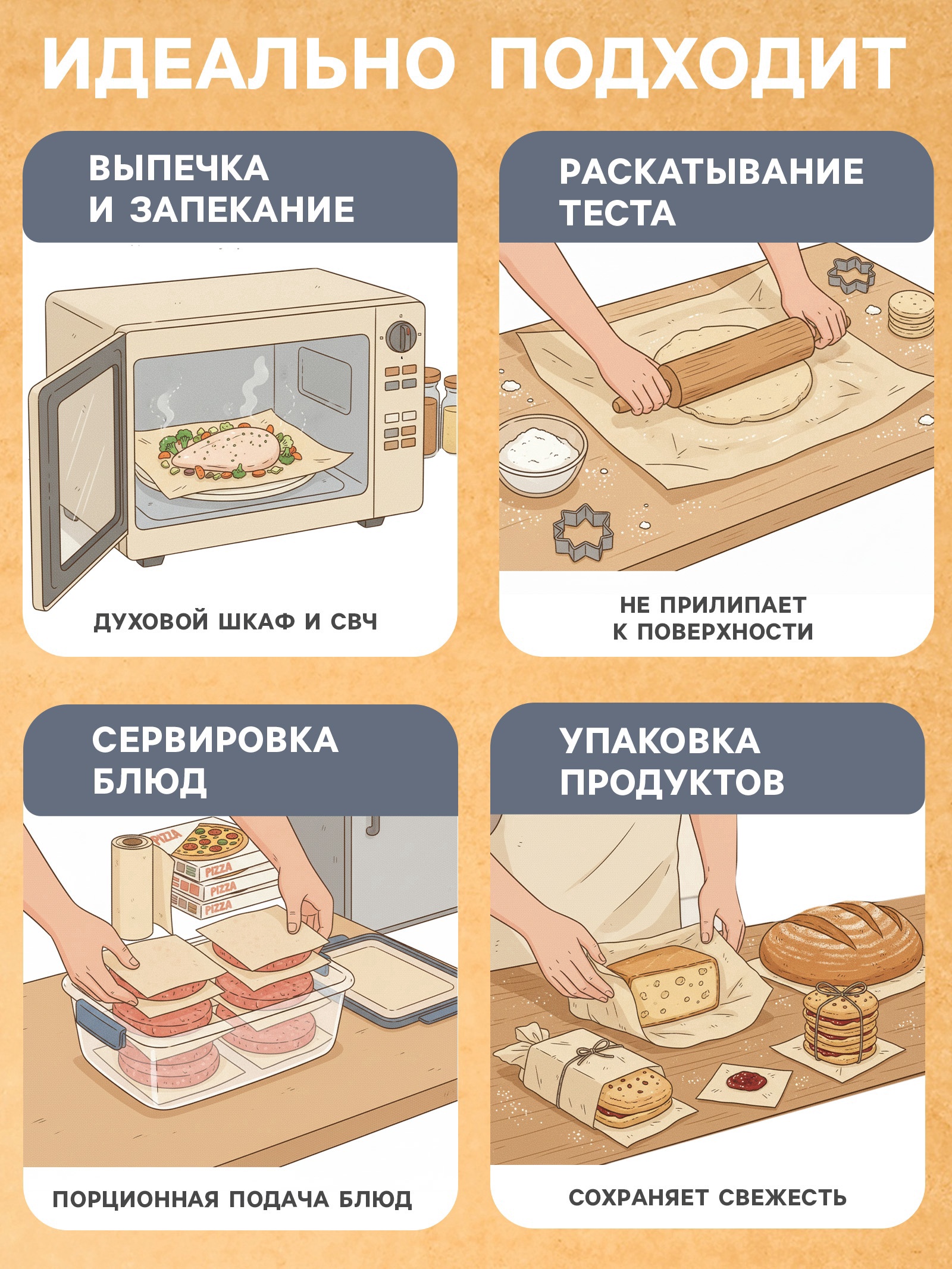 На нём можно готовить без растительного масла и других жиров. Благодаря силиконовому покрытию выпекаемые продукты не пригорают, легко отделяются от поверхности пергамента. Можно использовать для упаковки, хранения и разогрева кулинарных изделий, бутербродов, готовых блюд из мяса, рыбы и т. д.