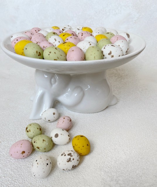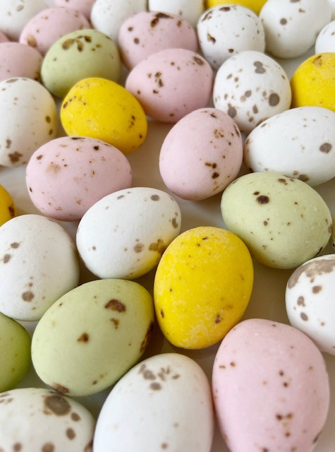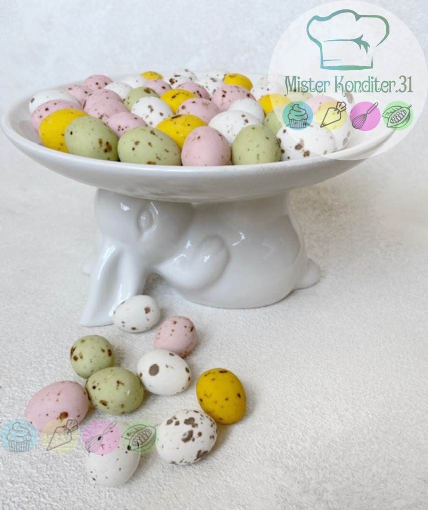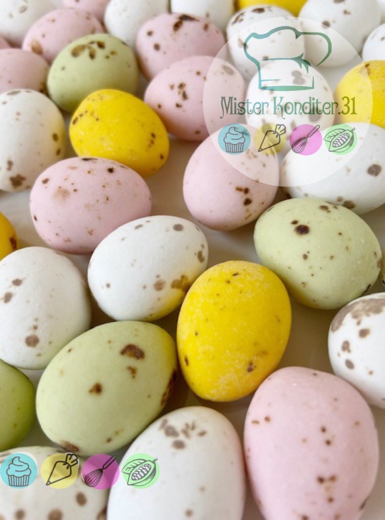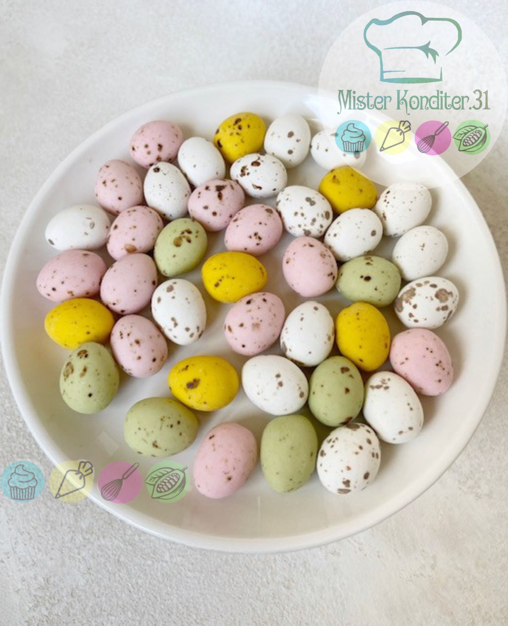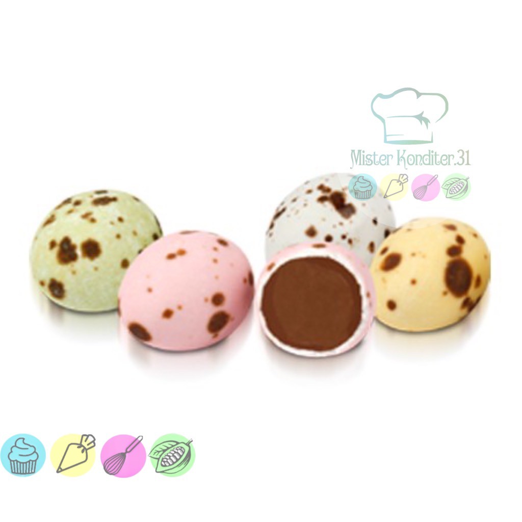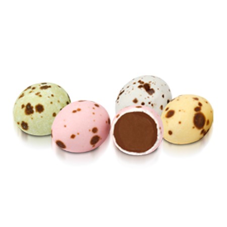 Шоколадные изделия, покрытые сахарной глазурью, с шоколадно-ореховой начинкой в виде перепелиных яиц белого, розового, желтого и зеленого цвета.