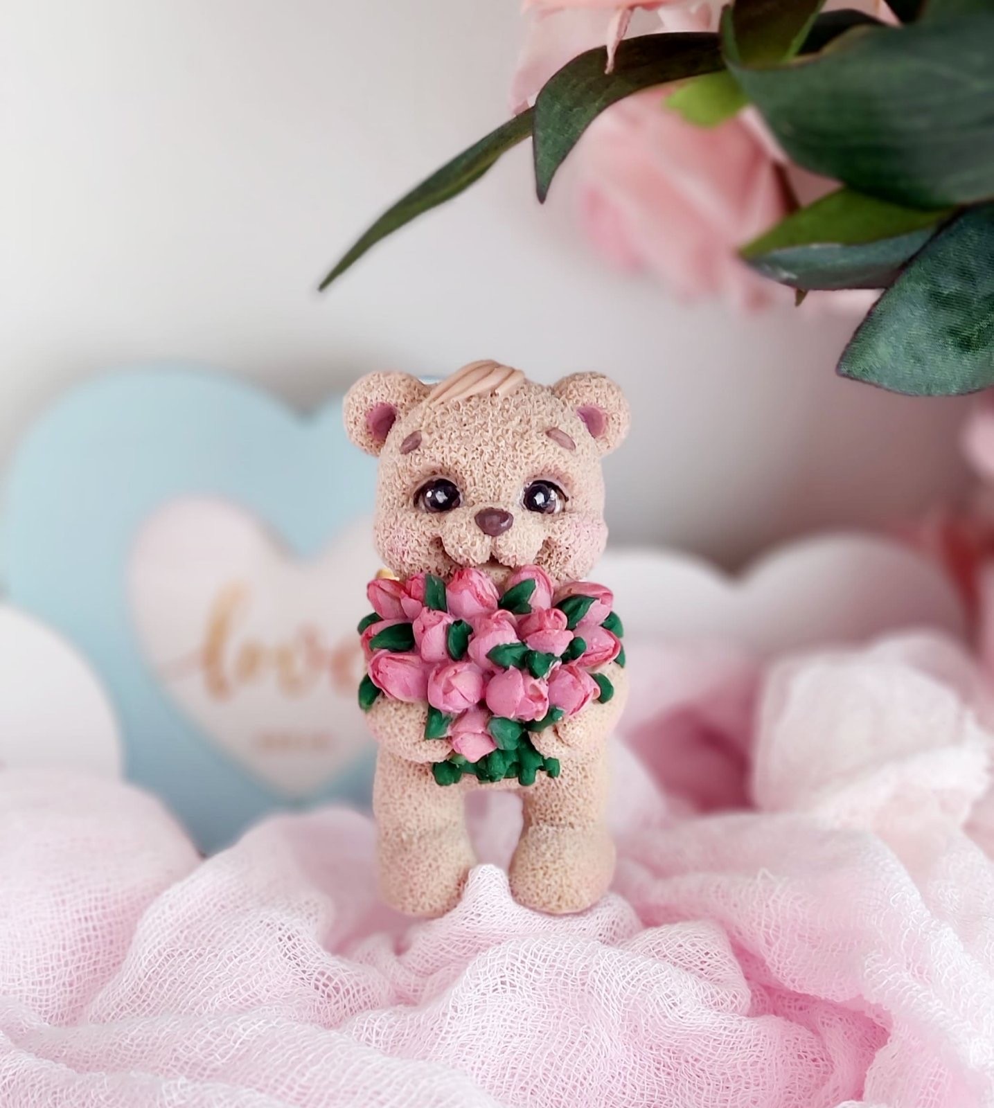 Готовая фигурка из шоколадной глазури в форме Мишки -малыша с букетом с декором. Шоколадное украшение объемное. Продается по 1 шт.
