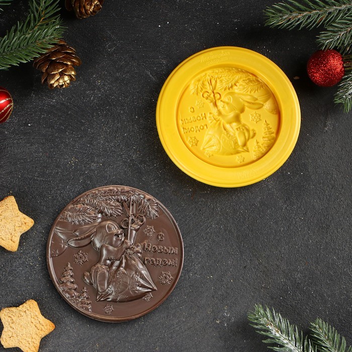 Форма для шоколадной медали «Новогодний зайчик» — оригинальный подарок на Новый год. Кондитерская форма изготовлена из прочного пищевого пластика, который не деформируется при заливке шоколада. Молд для шоколада легко моется и не требует особых условий хранения.