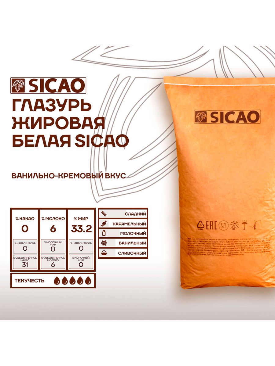Глазурь жировая Sicao – это незаменимый ингредиент для приготовления кондитерских изделий. Она представляет собой белую, блестящую и гладкую массу, которая придает сладкий вкус и приятный аромат. Глазурь изготовлена из высококачественных компонентов, что обеспечивает ее устойчивость к высоким температурам и влажности. Кроме того, она легко распределяется по поверхности изделия, быстро застывает и не крошится при нарезке. Идеально подходит для декорирования тортов, пирожных, печенья и других десертов.