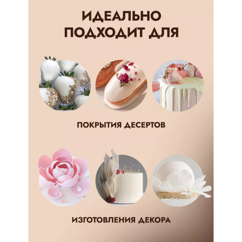Капкейки, торты и другие десерты засияют новыми гранями благодаря уникальному бельгийскому продукту в каплях. Шоколадные капельки (каллеты), которые входят в состав, легко плавятся и обладают нежным вкусом. Не требует темперирования, что открывает возможности для изготовления сложных фигурок и декоративных элементов без чрезмерного усилия. Поддерживайте эстетику своего творчества на высшем уровне с помощью идеальных украшений из шоколадной массы. Продукт отлично подходит для начинок различной сложности, что делает его универсальным выбором для любого кондитера. Используйте данные дропсы для приготовления фигур к 23 февраля, 8 марта, на день рождения и другие праздники. Выпускается в каллетах.