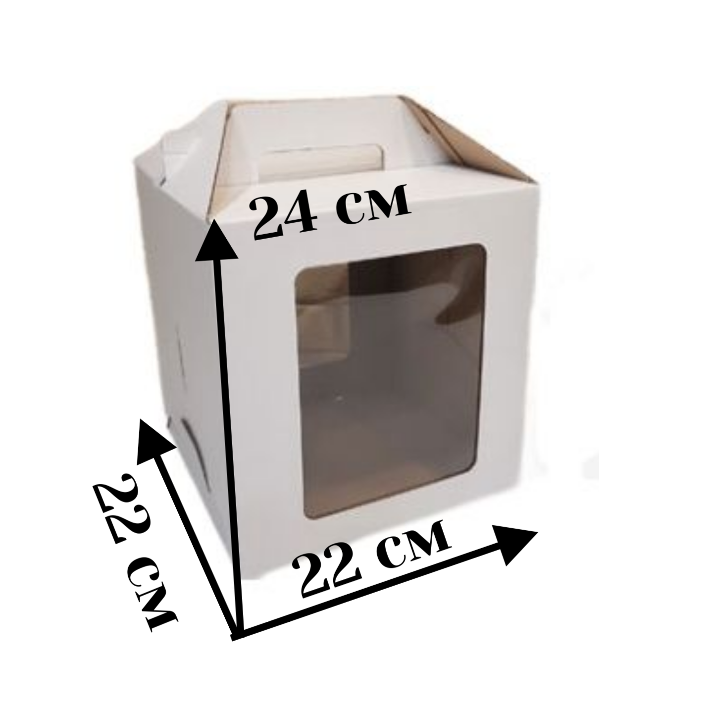 В коробке есть два фигурных окна, которые позволяют покупателям оценить оформление торта перед покупкой. Они делают упаковку праздничной и обеспечивают эффектную презентацию десерта. Коробка также имеет удобную ручку. Поставляется в разобранном виде, легко и быстро собирается.