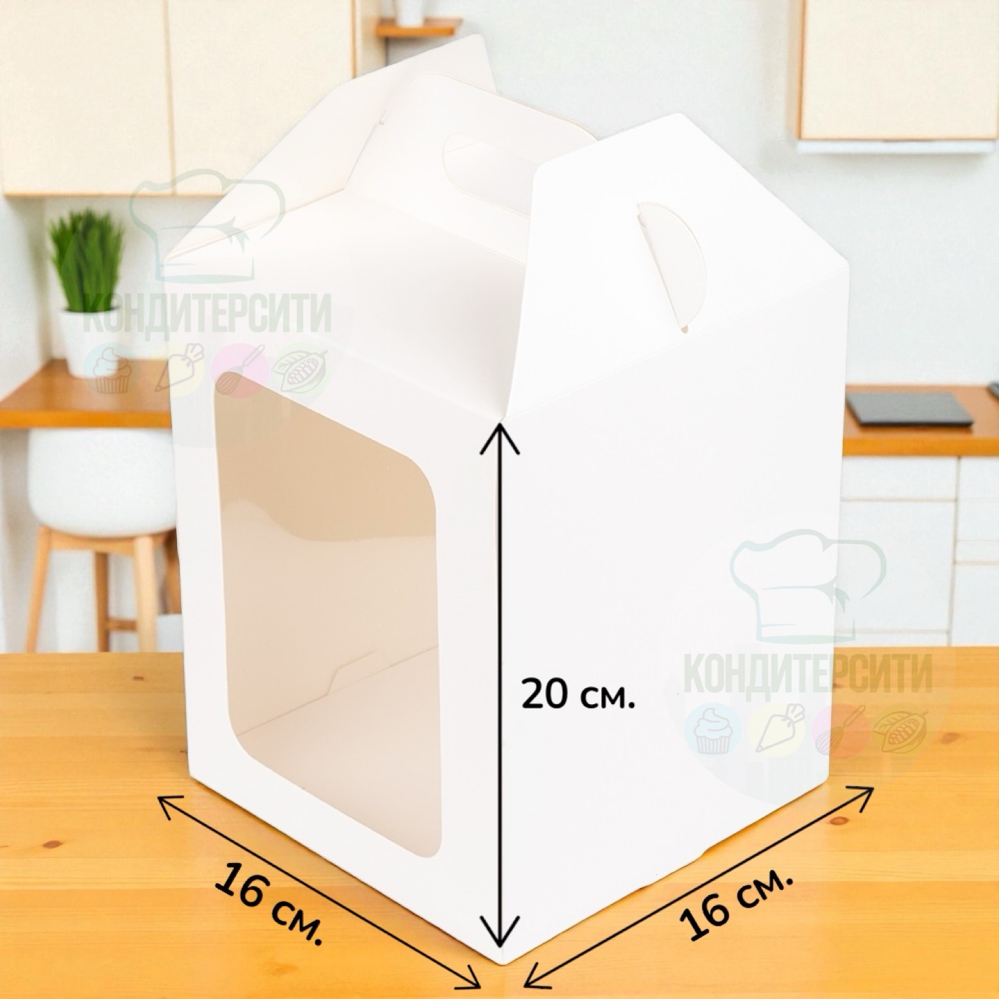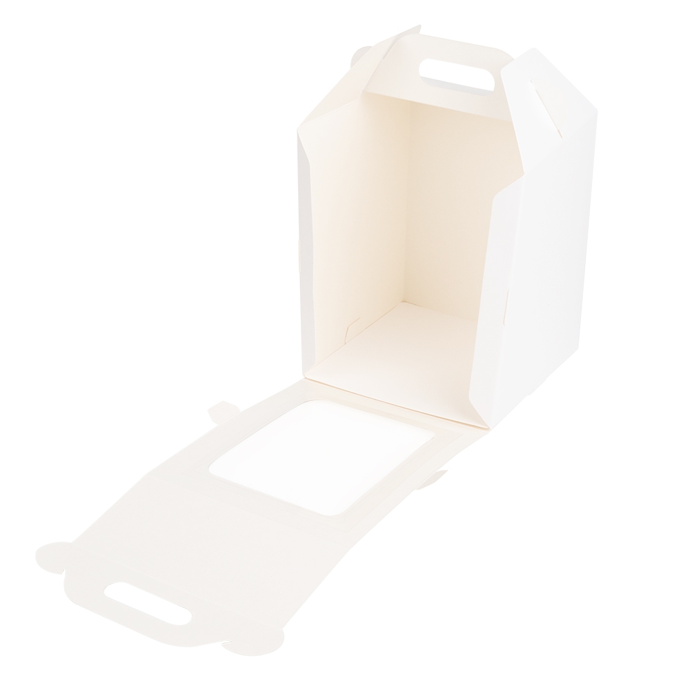 Белая коробка с ручкой и окном подходит для пасхального кулича, десертов, торта, капкейка, пряничного домика и просто для подарка.