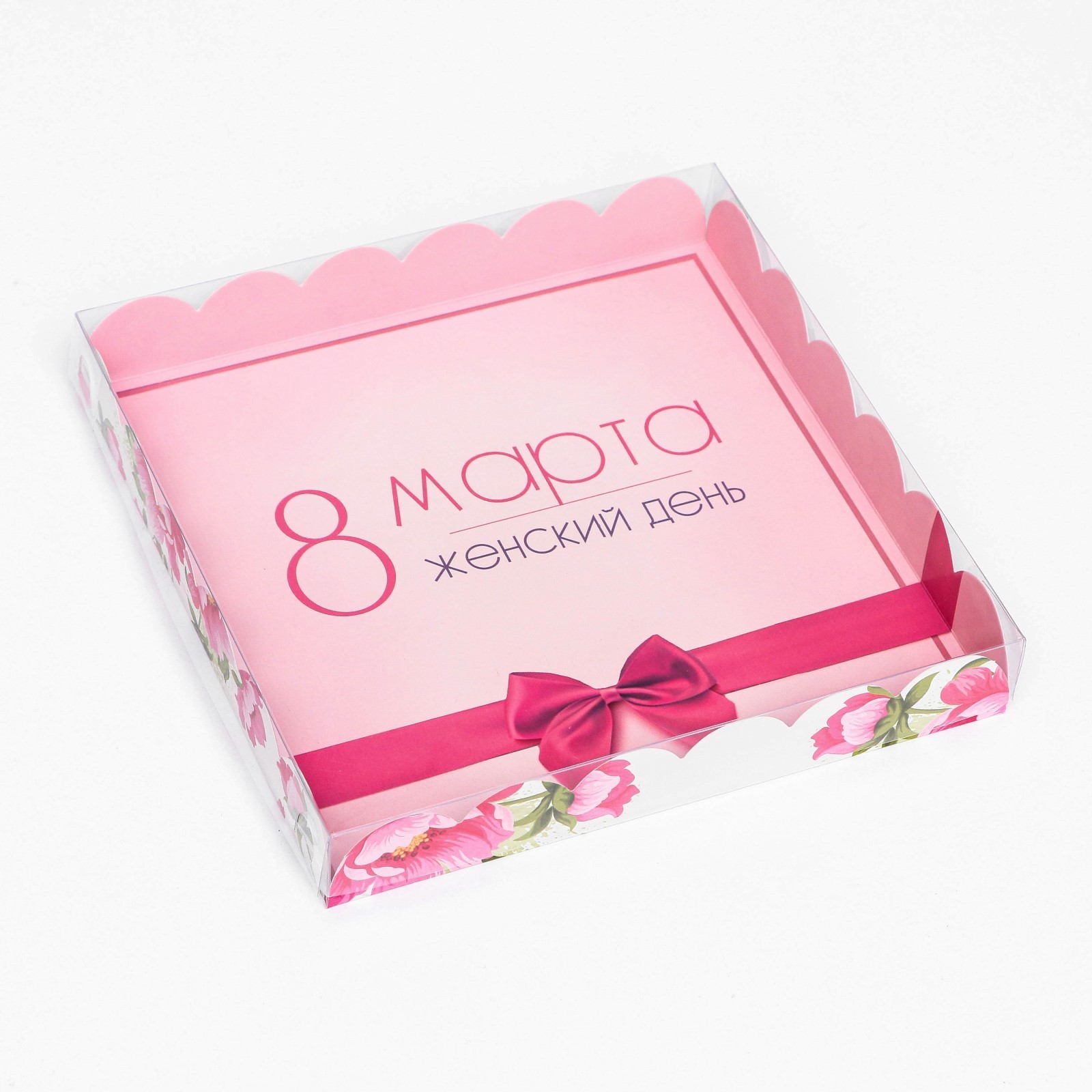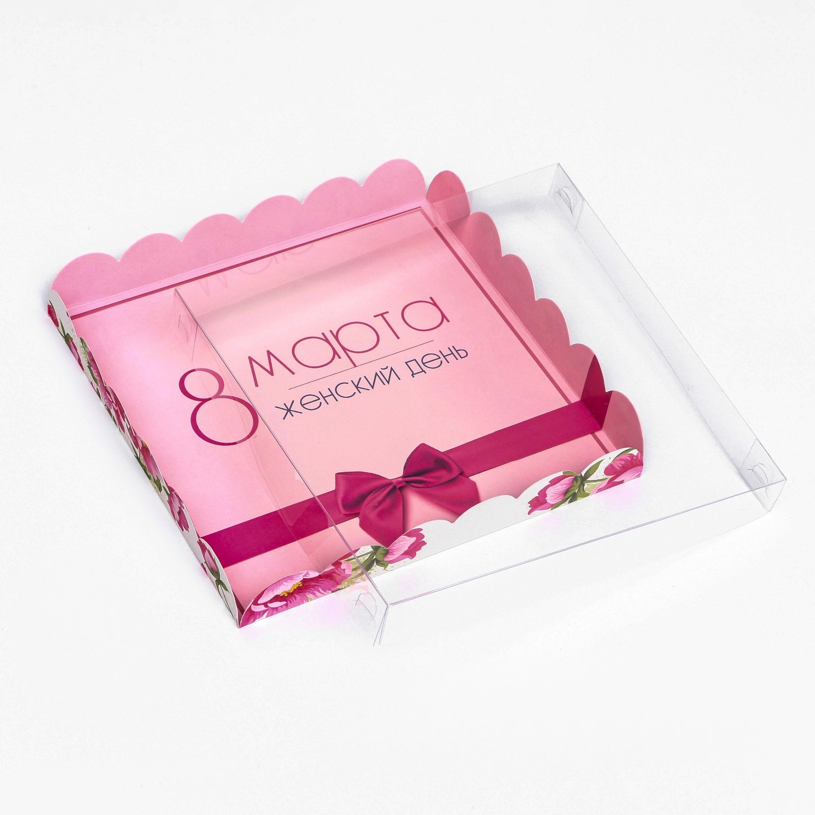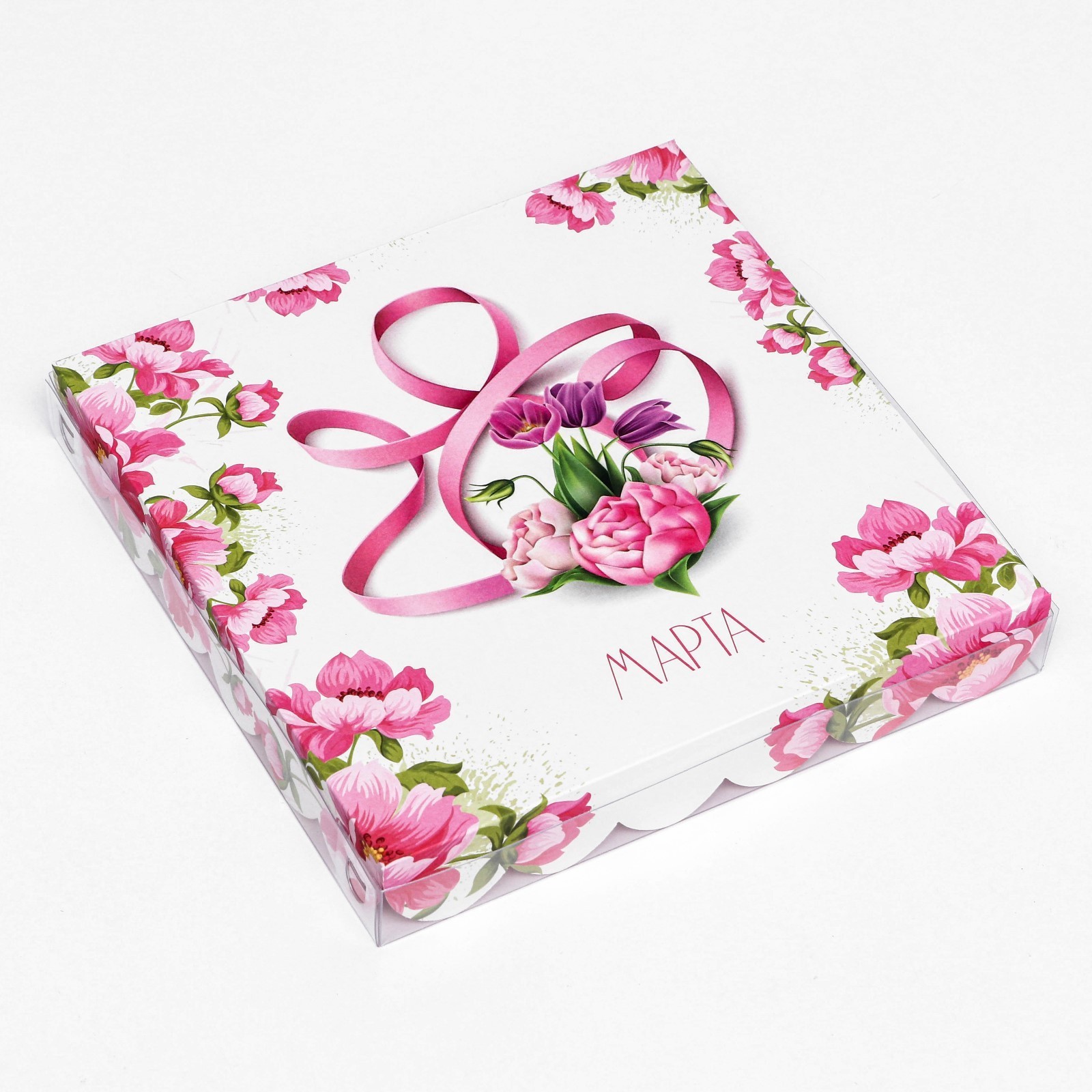 Коробка для печенья 8 марта 21 х 21 х 3. Коробка для печенья с прозрачной крышкой. Прекрасно подойдет для десертов, можно использовать для праздничного декора. Преимущества:- плотный картон;- сборная конструкция;- удобно при транспортировке. Для создания уникального и запоминающегося подарка рекомендуем использовать атласную ленту различных цветов.