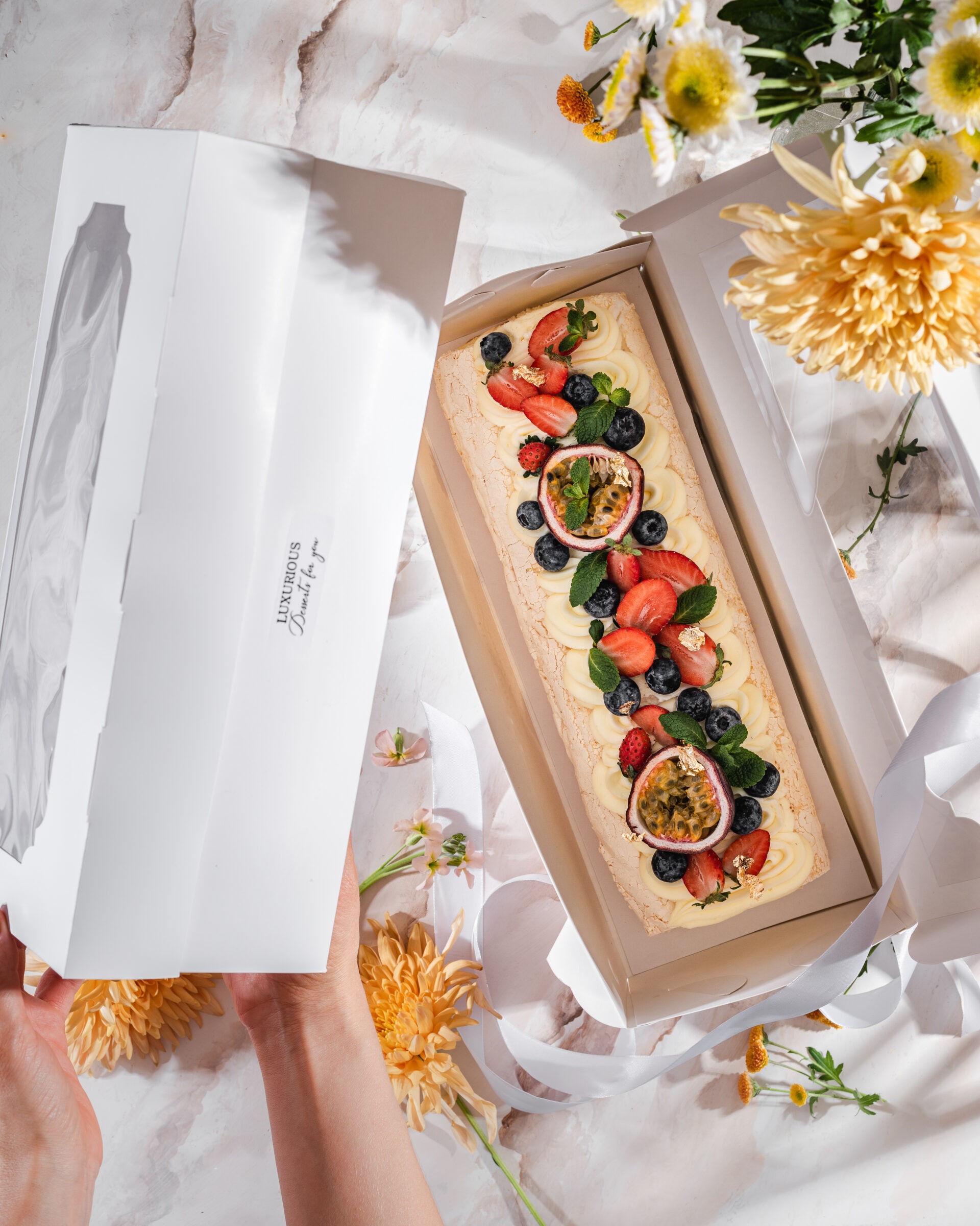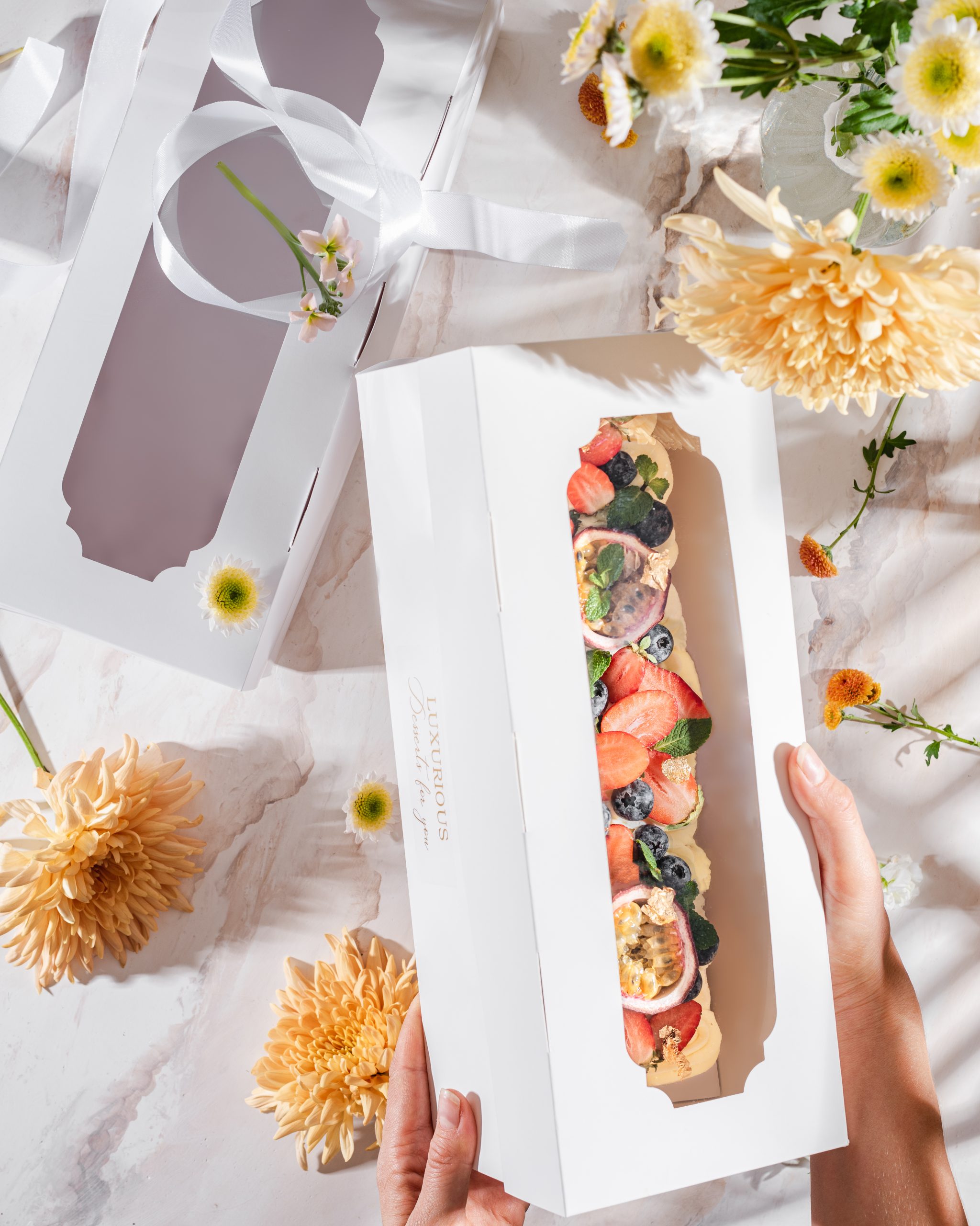 Стильная и качественная упаковка для рулета, пирожных, муссового торта «Полено», а также других десертов и подарков. Для создания уникального и запоминающегося подарка, рекомендуем использовать атласную ленту различных цветов.