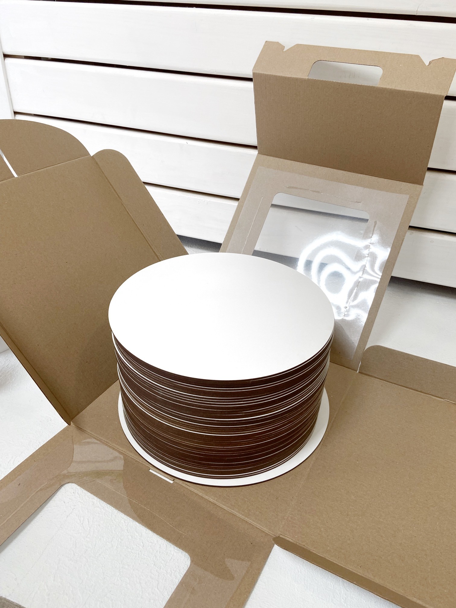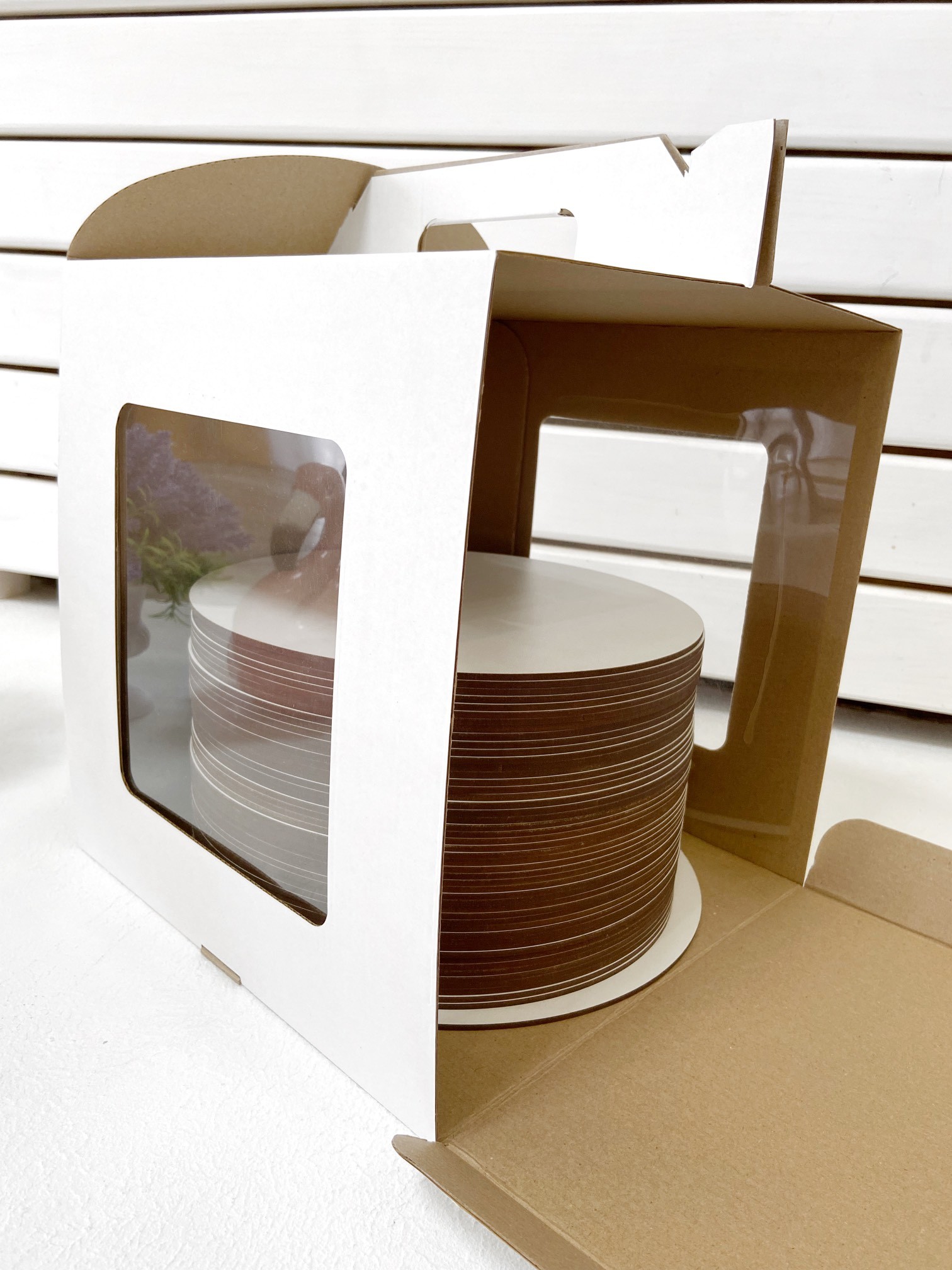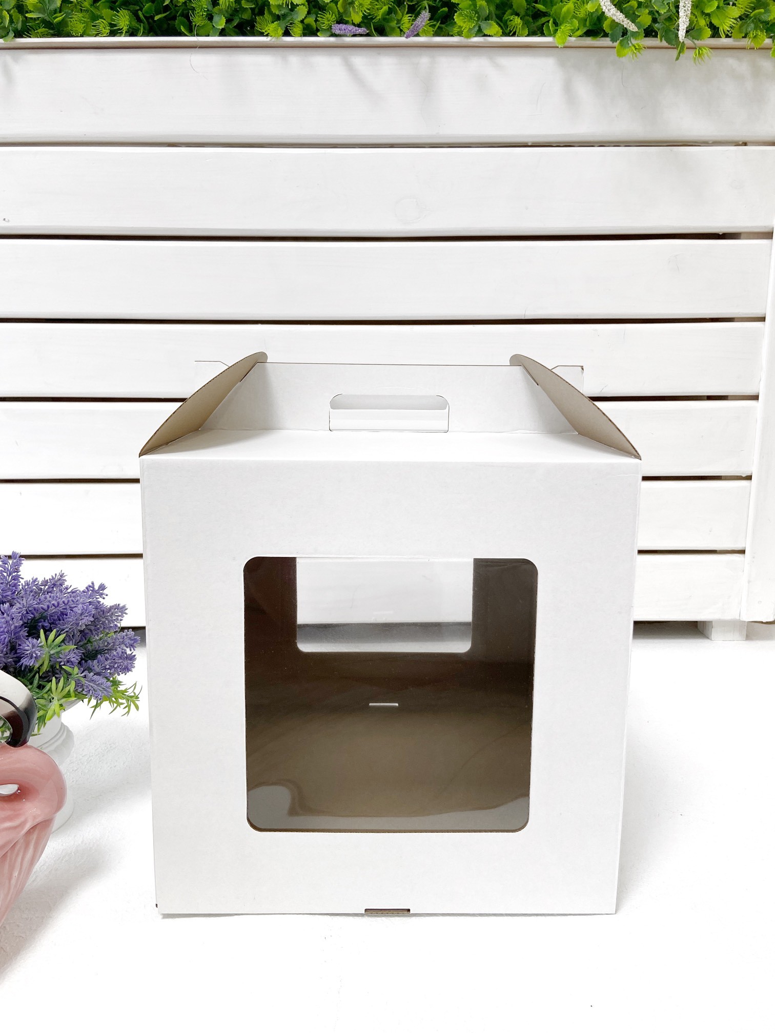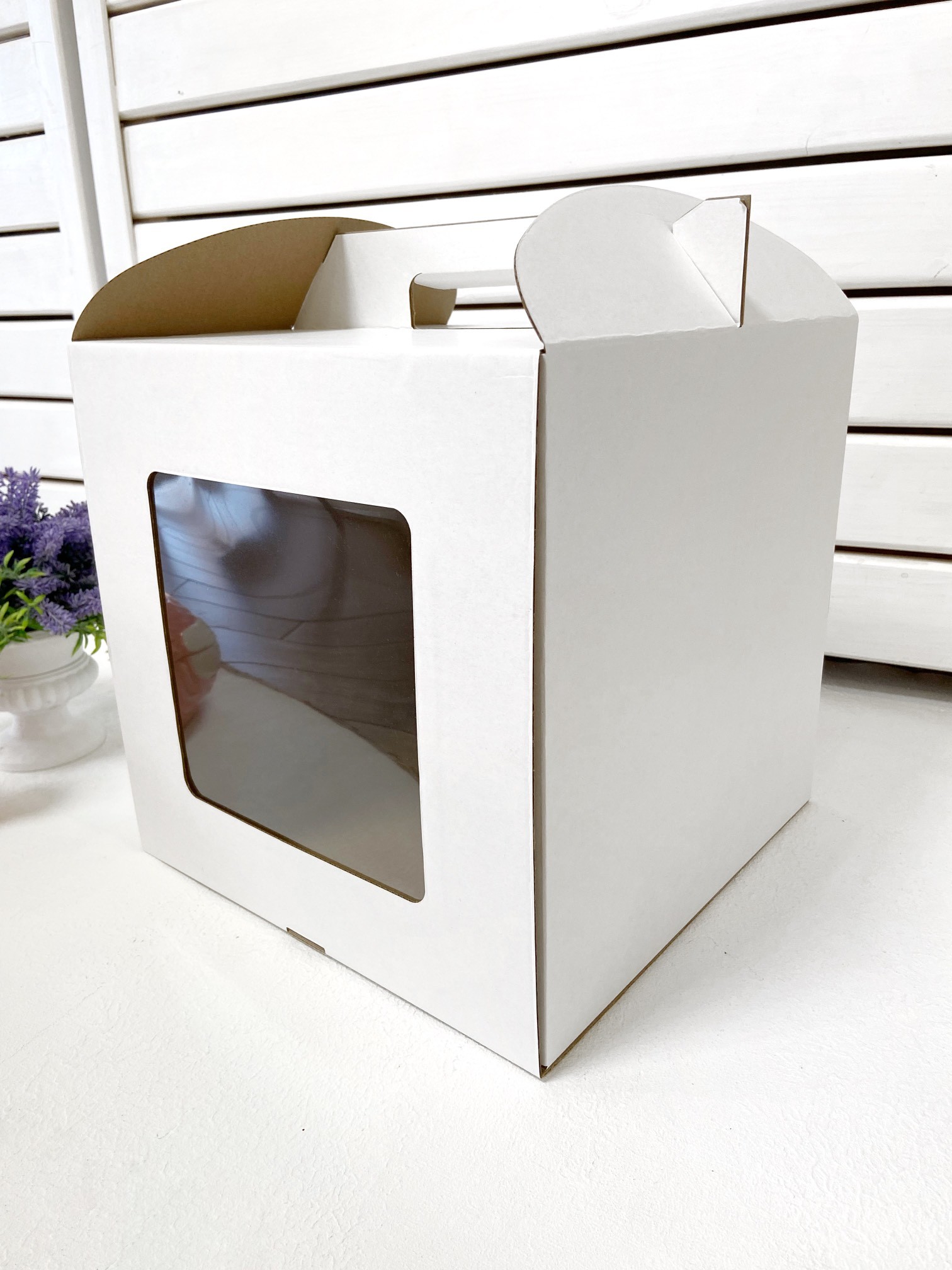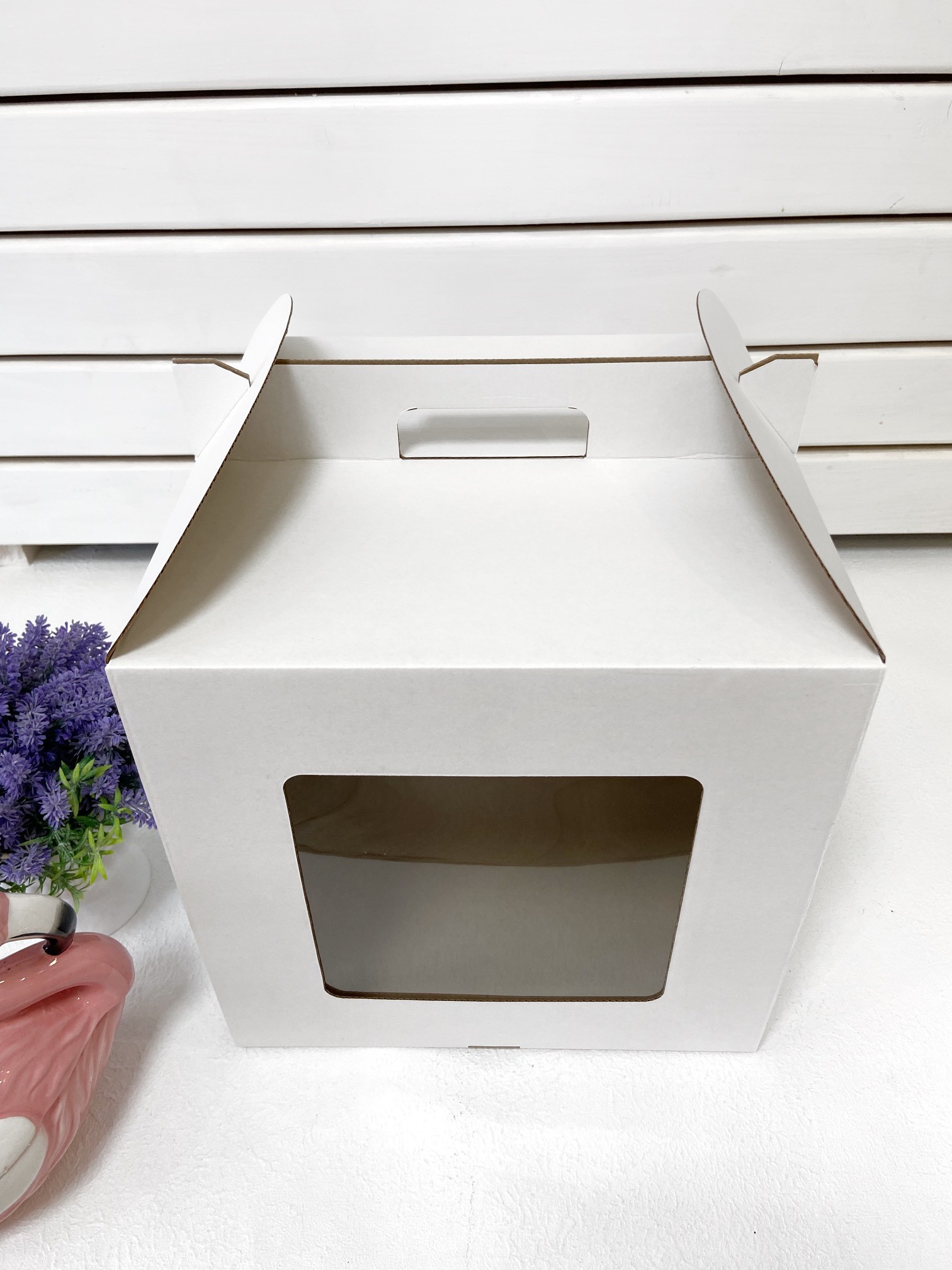 Коробка с двумя окнами и ручками из гофрокартона. Состоит из двух частей, что более надежно для транспортировки торта. Усиленная ручка, состоящая из трех частей гофрокартона.