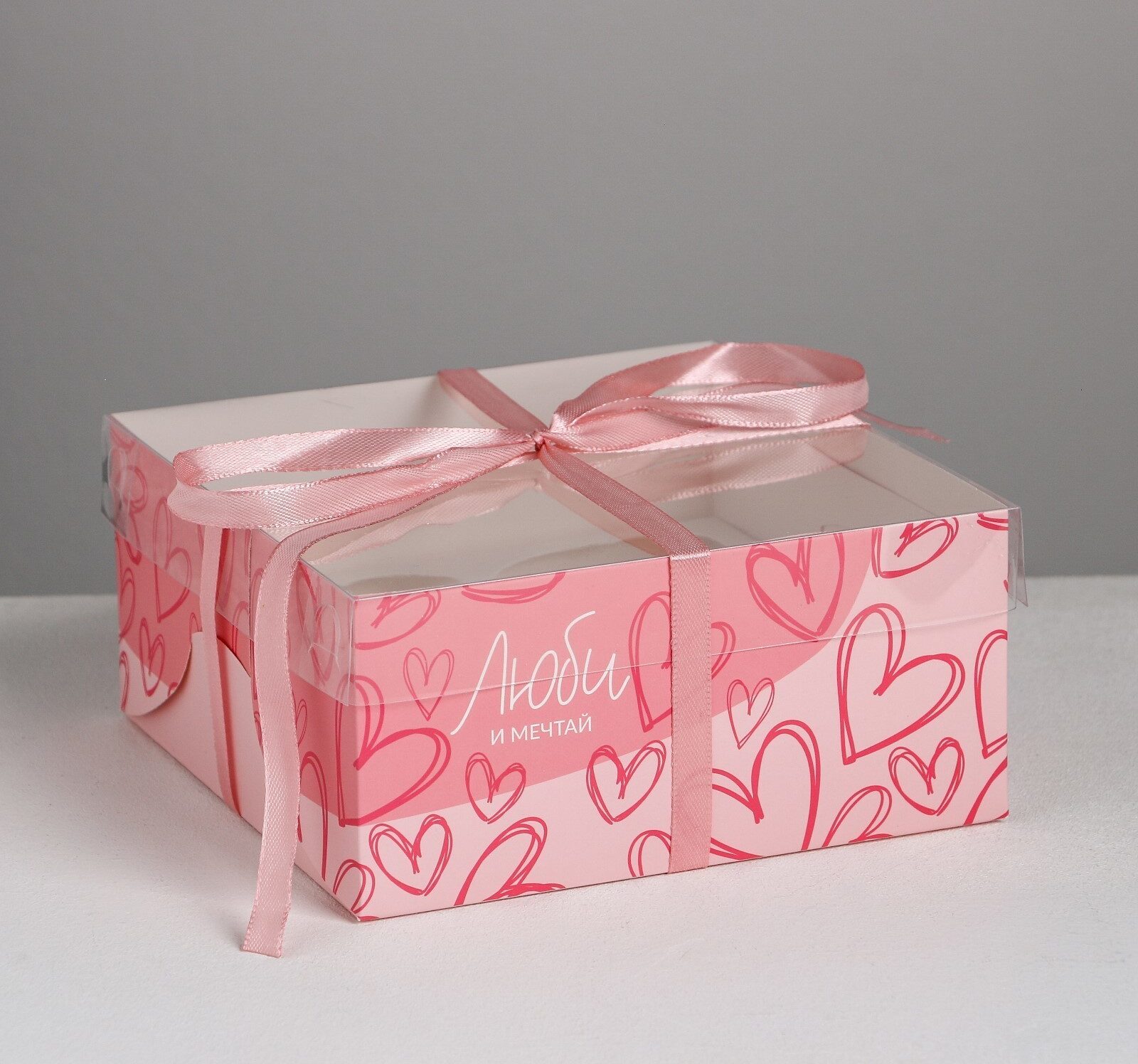 Упаковка на 4 капкейка с окном «Люби и мечтай». Коробка подарочная универсальная предназначена: капкейков, кексов, пирожных и т. д. Изготовлена из плотного картона. Прекрасно подойдет для оформления подарка, и праздничного декора. Преимущества: плотный картон; оригинальное оформление; удобно при транспортировке. Для создания уникального и запоминающегося подарка рекомендуем использовать атласную ленту различных цветов.