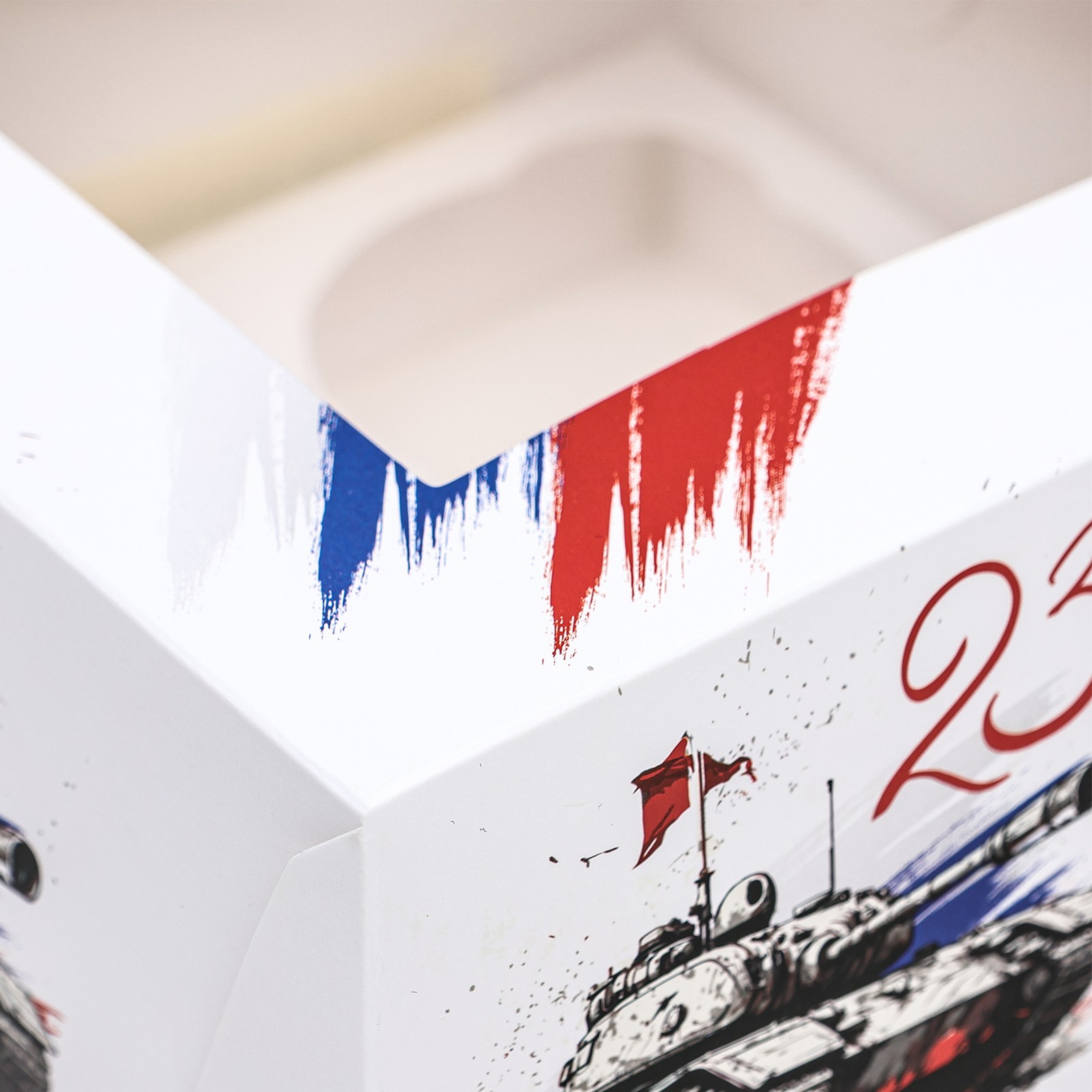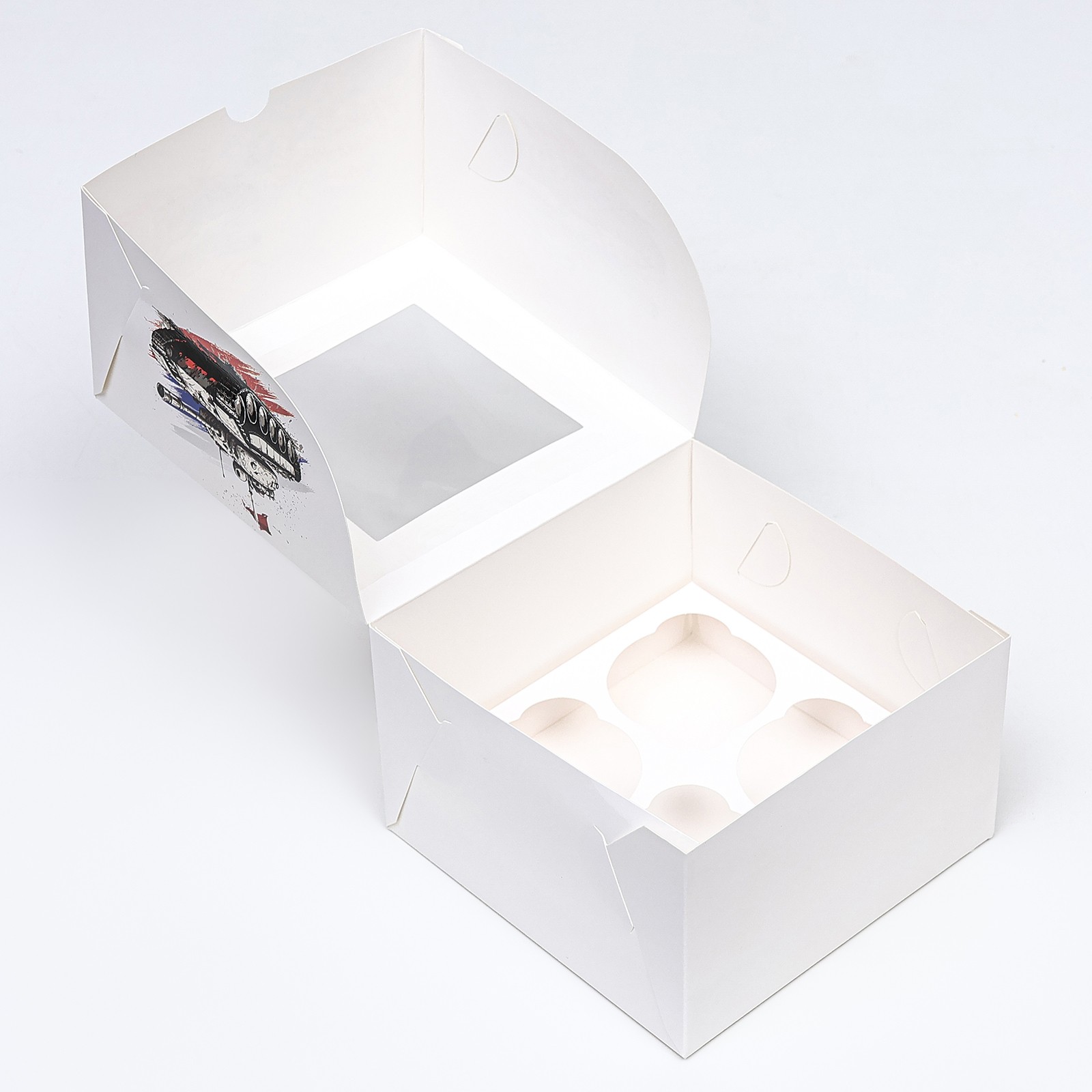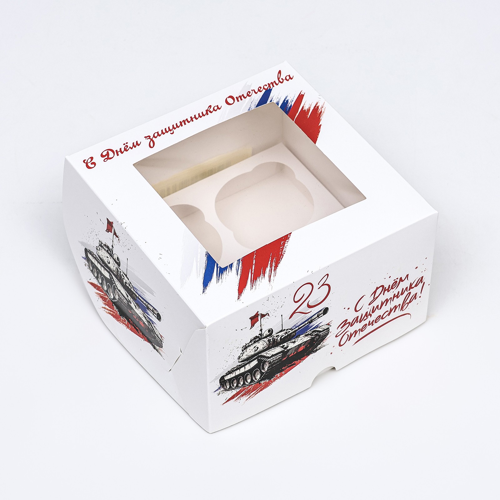 Упаковка на 4 капкейка с окном «С 23 февраля». Коробка подарочная универсальная предназначена: капкейков, кексов, пирожных и т. д. Изготовлена из плотного картона. Прекрасно подойдет для оформления подарка, и праздничного декора. Преимущества: плотный картон; оригинальное оформление; удобно при транспортировке. Для создания уникального и запоминающегося подарка рекомендуем использовать атласную ленту различных цветов.