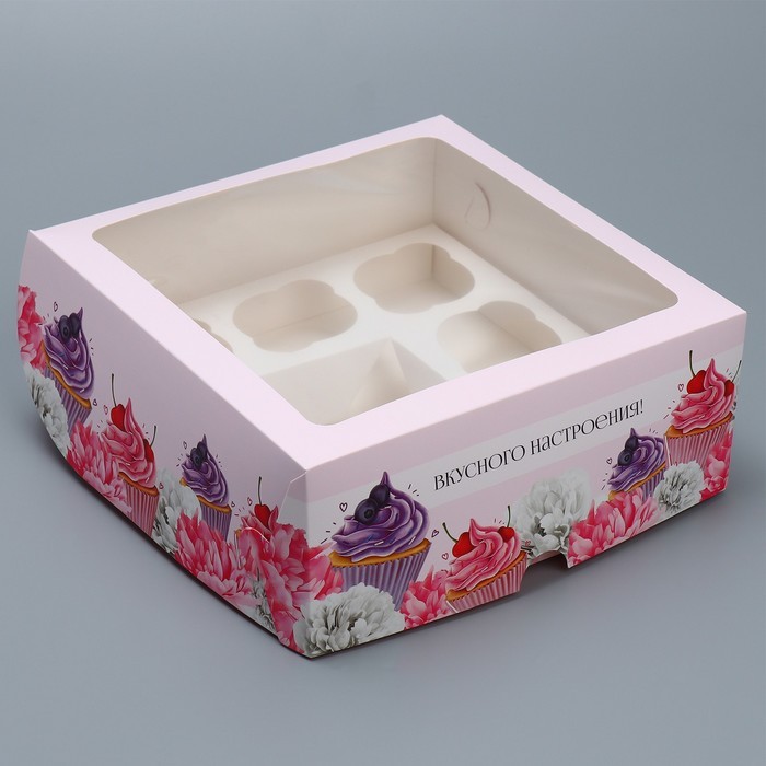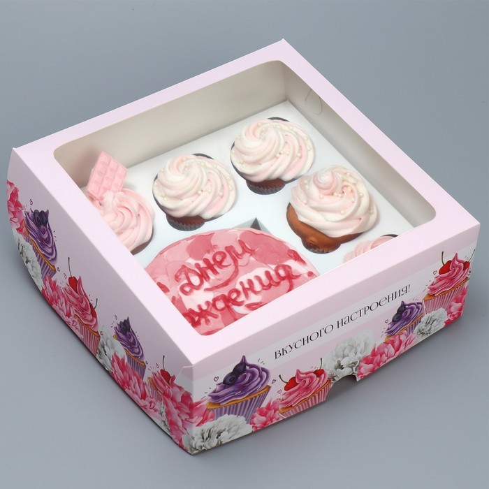 Подарочная коробка для 5 капкейков и 1 бенто. Дизайн коробки выполнен в цветочном стиле, эстетически приятный. Белый, фиолетовый и красный цвета гармонично сочетаются, создавая яркий образ. Выполнена из качественного картона, приятного на ощупь. Для более праздничного оформления можно перевязать коробку атласной лентой. Легко собирается без клея и скотча, хорошо переносит транспортировку, защищает изделия от воздействия окружающей среды.