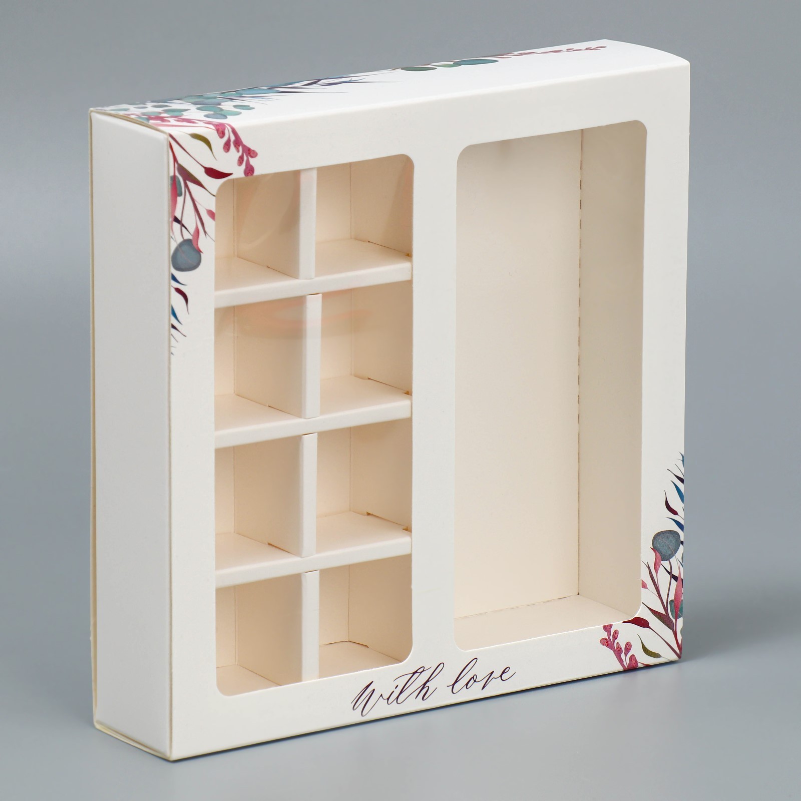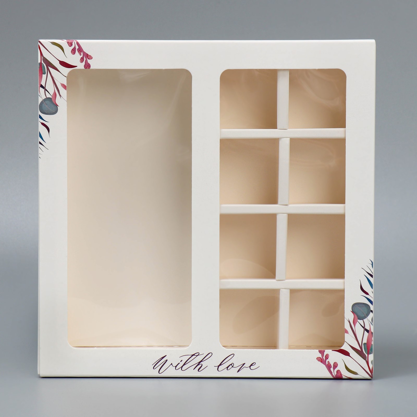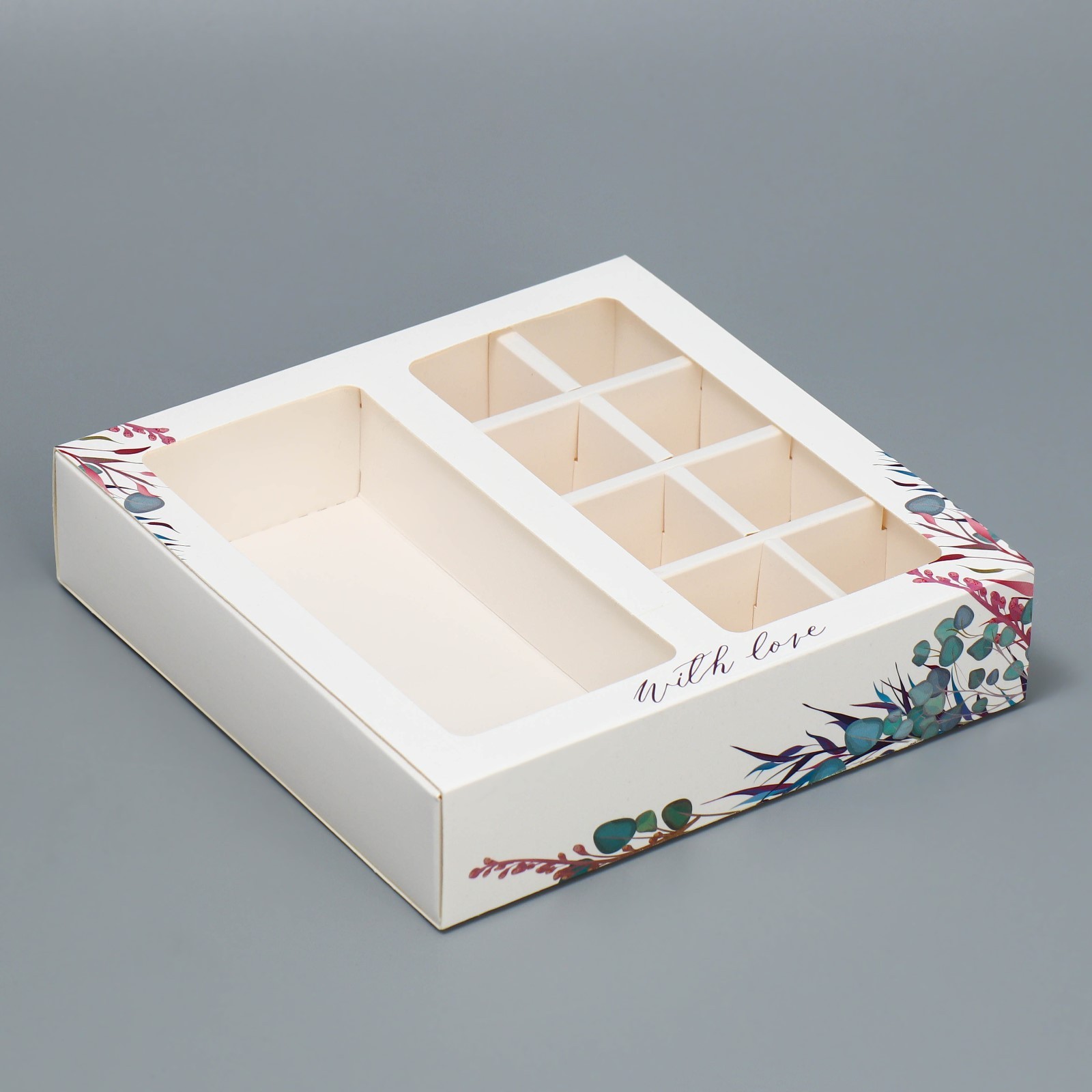Изготовлена из высококачественного белого глянцевого целлюлозного картона премиум класса, эта коробка обеспечивает прочность и долговечность. Коробка позволяет вместить до 8 конфет и одну шоколадную плитку. Особенностью коробки является прозрачная крышка . Это позволяет увидеть содержимое коробки и сделать подарок еще более привлекательным.