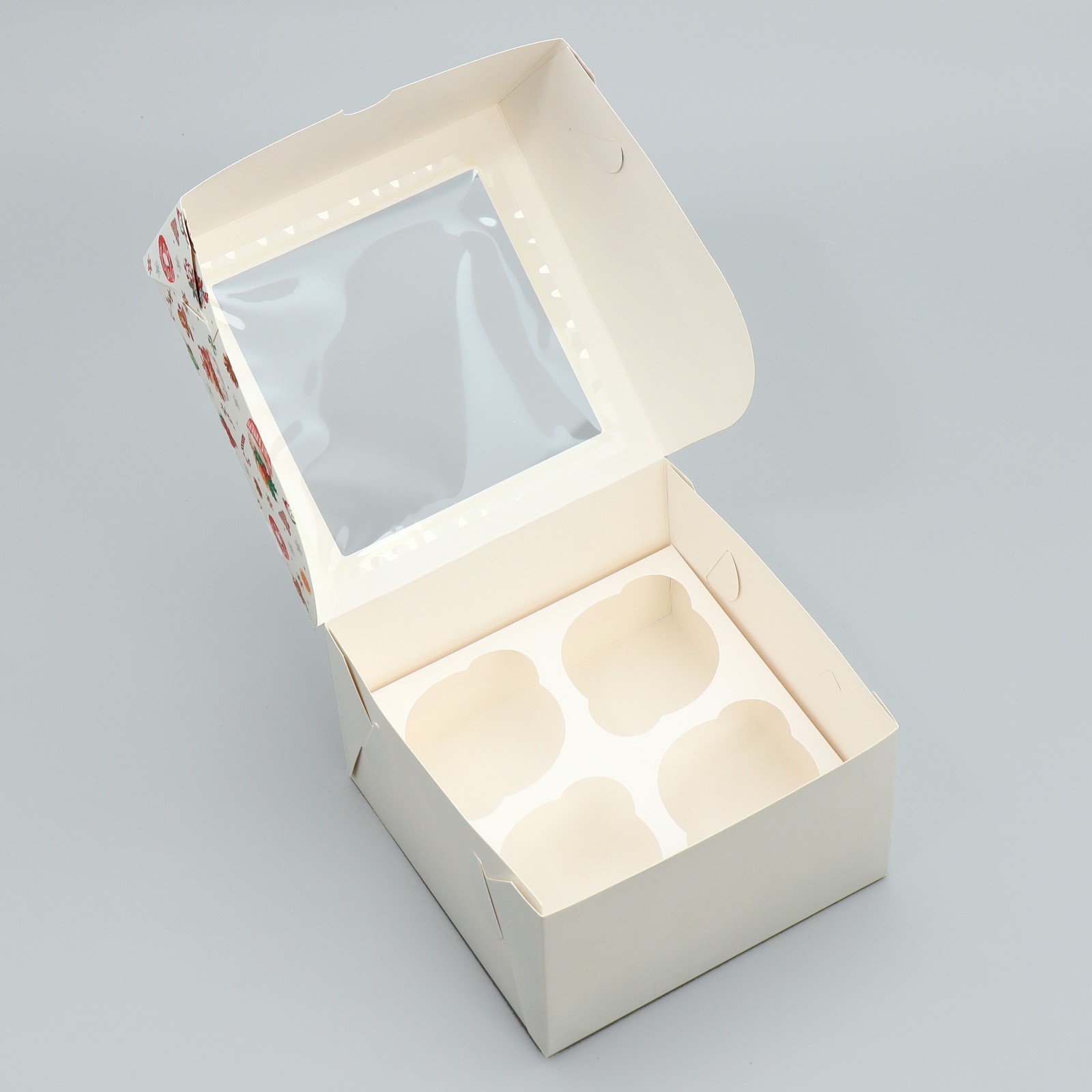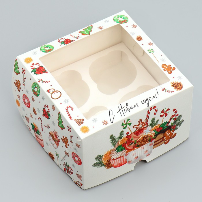 Упаковка на 4 капкейка с окном «С Новым годом!». Коробка подарочная универсальная предназначена для: капкейков, кексов, пирожных и т. д. Изготовлена из плотного картона. Прекрасно подойдет для оформления подарка, и праздничного декора. Преимущества: плотный картон; оригинальное оформление; удобно при транспортировке.
