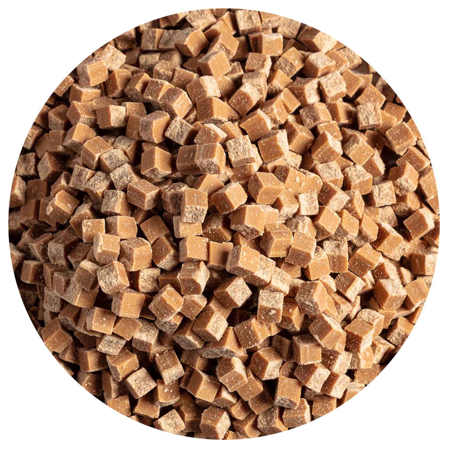 Помимо формулы, размер (6 x 6 x 6 мм) также является фундаментальной отличительной чертой. Благодаря этому размеру кубики растворяются во время выпечки, создавая восхитительную каплю карамели со вкусом ириски.