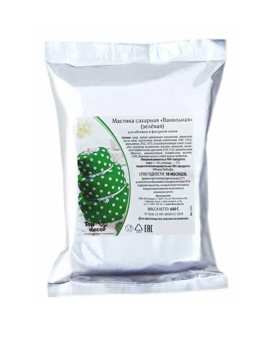 Мастика представляет собой сахарное тесто, которое используется для декорирования тортов и других кондитерских изделий. Подходит для обтяжки тортов и пирожных, а также для изготовления декора (фигурная лепка). Мастика хорошо окрашивается водорастворимыми красителями.
