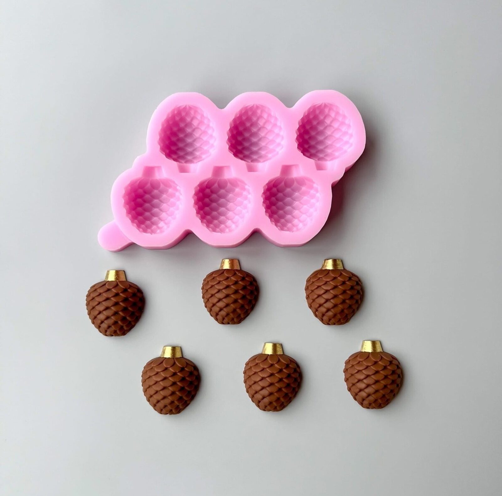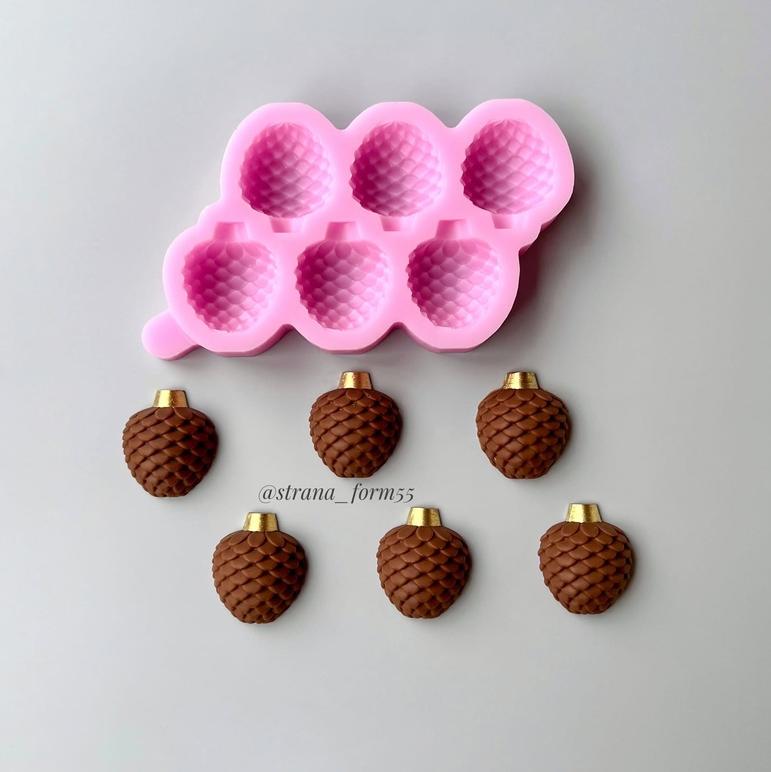 Молд «Шишки» изготовлен из мягкого, пищевого, сертифицированного силикона с использованием вакуумного оборудования. Подходит для работы с шоколадом, мармеладом, глазурью, зефиром, карамелью, мылом, гипсом и т.д.