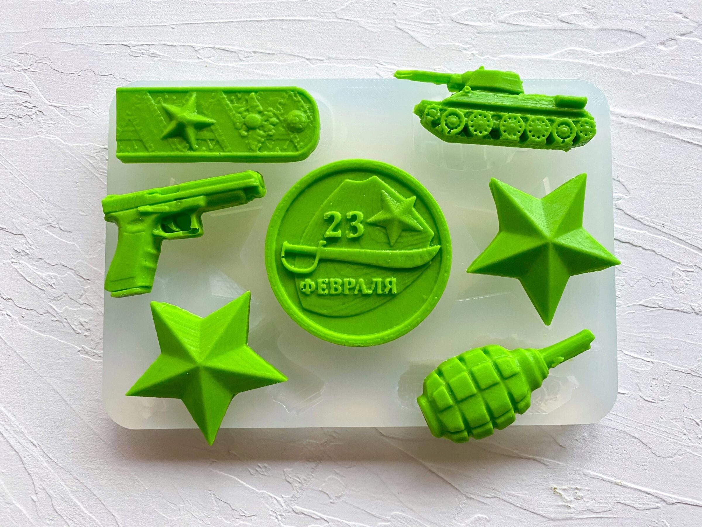 Молд «Набор «23 Февраля»»- это мягкая силиконовая форма для создания объемных фигурок для шоколадных букетов, для декора торта, для наборов конфет. Молд для шоколада подходит для глазури, мастики, марципана. Часто используется как молд для гипса и для эпоксидной смолы, молд для мыла. Молд изготовлен из термостойкого пищевого силикона. Рабочая температура от -30 до +250 градусов. При заливке шоколада в форму иногда требуются: простукивание, наклон, нажим, переворачивание формы для проливки всех полостей фигурки. Для более удобного извлечения фигурки и сохранения всех деталей рекомендуем залитую форму помещать в морозилку на 30-60 минут.