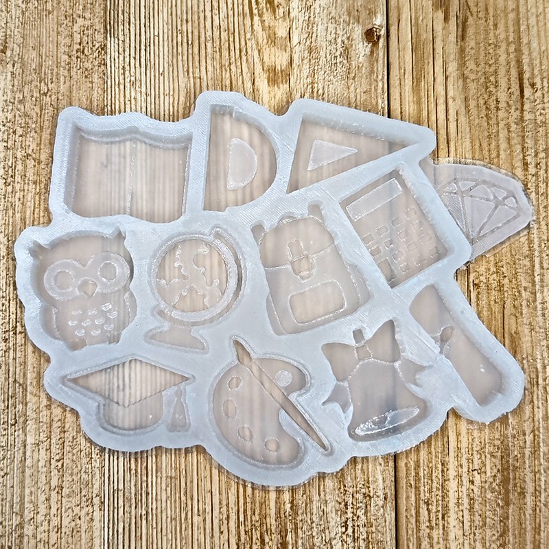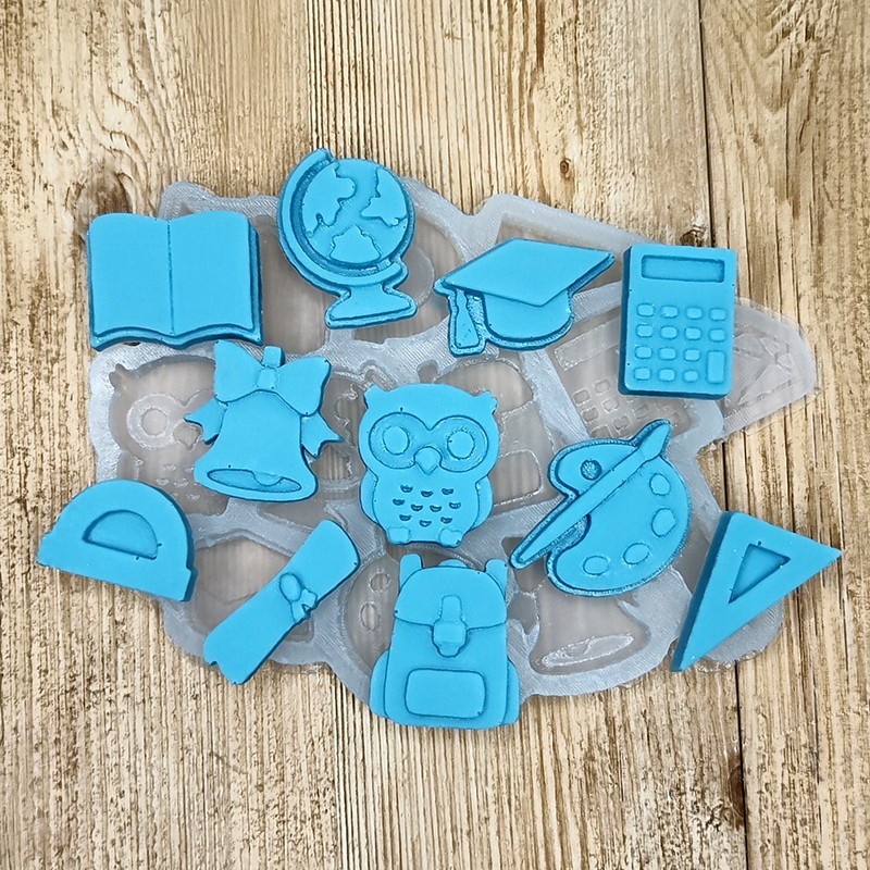 Размеры 1-2,5 см, толщина 8 мм. Общий вес готовых изделий 30 грамм. Пищевой силикон.