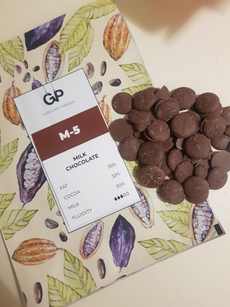 Молочный шоколад М-5 GP выпускается в виде шоколадных капель (калет,дропсов). Вкус молочного шоколада сладкий, нежный, с молочными. Используйте шоколад GP для создания шоколадных тортов, ганашей, домашних конфет, печенья, а также просто ешьте его с чаем или кофе. Имеет стандартную текучесть — 3 капли, то есть шоколад универсальный и подходит для любых целей — приготовление начинок, создания крупных фигур или фигур с тонким корпусом, покрытия десертов. Какао 33,5 %. Жирность 35 %.