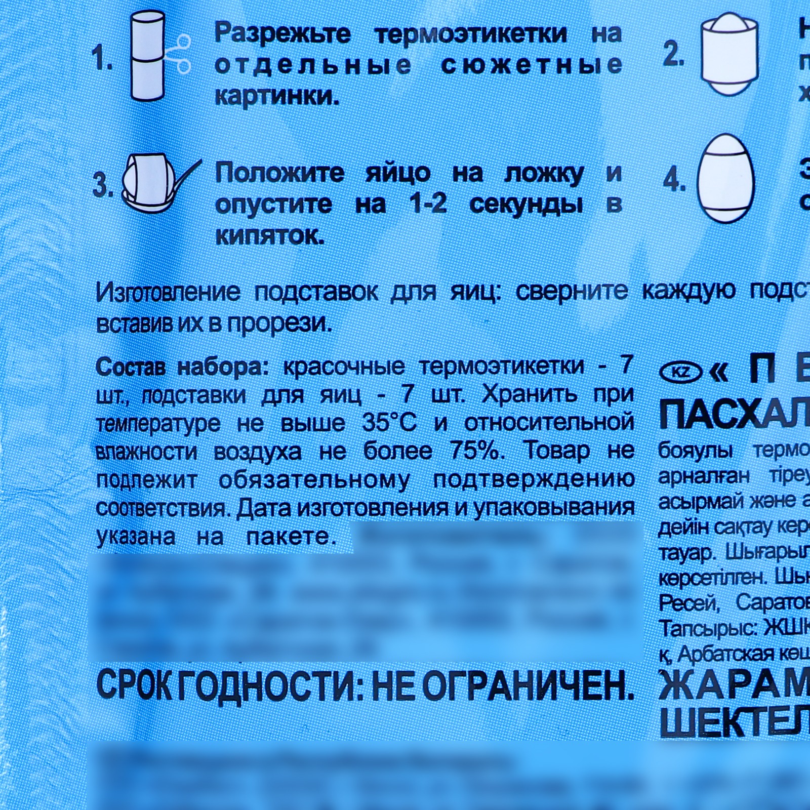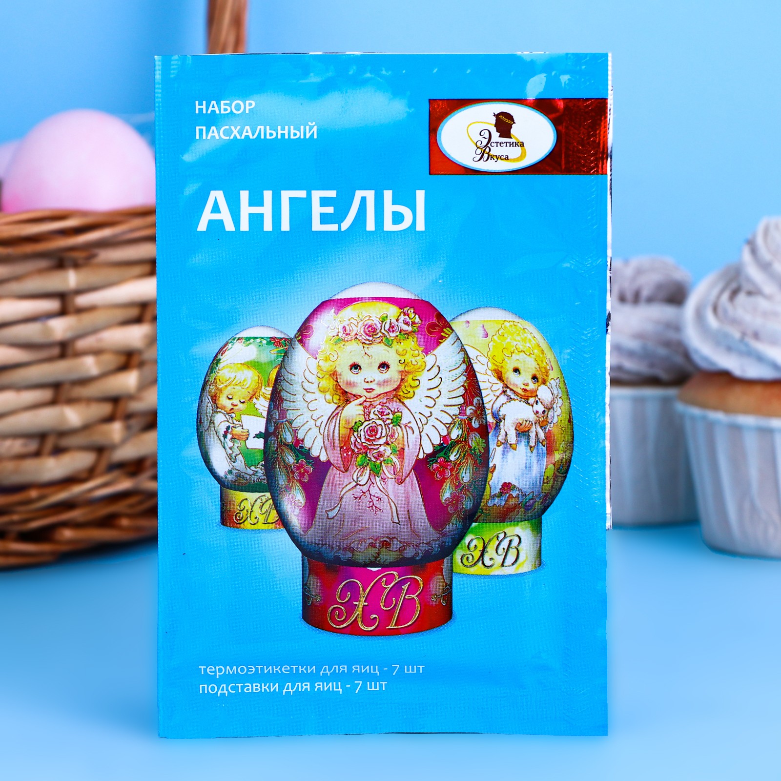 Пасхальный набор «Ангелы» для украшения яиц станет прекрасным украшением праздничного стола. В набор для украшения входит: -подставки для яиц (7 шт.); -термонаклейки (7 шт.) Специальная термоусадочная наклейка дает возможность резко сократить время процесса приготовления к празднику. Термопленка удобная и безопасная в использовании. Пасхальный набор поможет вам и вашем детям легко, без особого труда украсить пасхальные яйца в канун Светлого праздника Пасхи. Способ применения термонаклеек: разрезать пленку на отдельные этикетки, отварить яйца, остудить, надеть этикетку на яйцо, опустить яйцо в этикетке в кипящую воду на 3-5 секунд.
