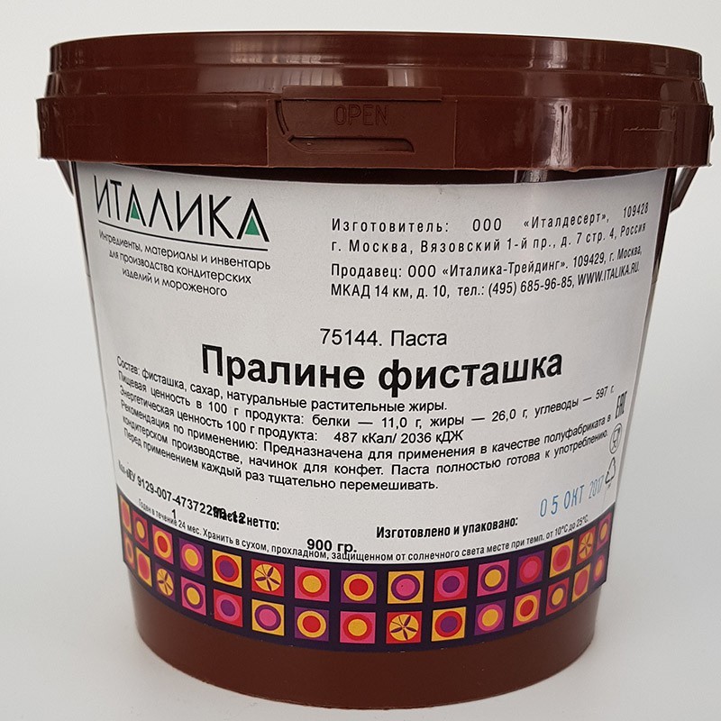 Пралине используют в качестве полуфабриката при изготовлении тортов, выпечки, кремов, муссов, а также как добавку в десерты и для ароматизации мороженого. Можно смешать его с шоколадом для создания начинок для формованных конфет и шоколадных батончиков. СОСТАВ: фисташка (50%), сахар, натуральные растительные жиры. Пищевая ценность в 100 г продукта: жиры — 26 г, углеводы 59 г, белки 11 г. Энергетическая ценность 2036 кДж/487 ккал. Хранить в сухом, прохладном, защищенном от солнечного света месте при температуре от 10 С до 25 С.