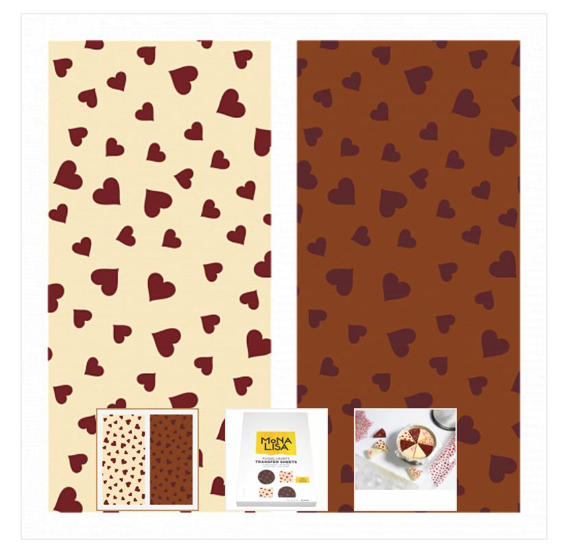 Высококачественные переводные листы для шоколада Mona Lisa «Парящие сердца» на основе 100% какао-порошка предназначены для создания уникального узора на поверхности шоколада.
