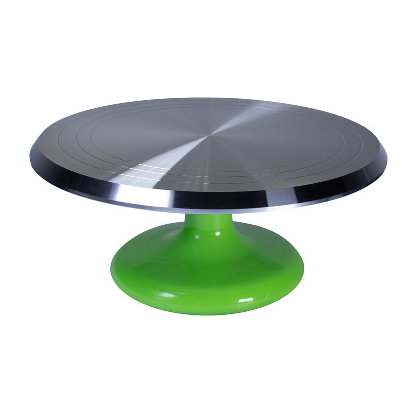 Очень стильная вращающаяся металлическая тортовница, столик для торта, идеальна как в роли подставки для изготовления тортов, нанесения мастики, декорирования, так и как подставка под торт для украшения праздничного стола. Подставка под торт диаметром 29 см, выдерживает даже тяжелые крупные торты, очень плавно вращается благодаря металлической основе и качественному металлическому подшипнику. Нижняя часть опоры выполнена из противоскользящего материала. Верхняя поверхность выполнена из пищевого алюминия. Отличный, качественный поворотный столик для изготовления и подачи тортов.