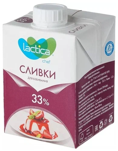 Сливки ультрапастеризованные LACTICA это полностью готовый к употреблению питьевой продукт. Они изготовлены из натурального качественного молока, густые, легко взбиваются в нежный сливочный крем и являются незаменимым ингредиентом для кондитерских изделий. Их не нужно кипятить и можно давать детям. Массовая доля жира 33,0%.