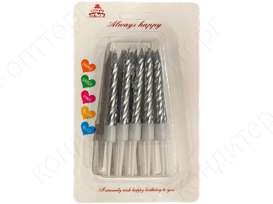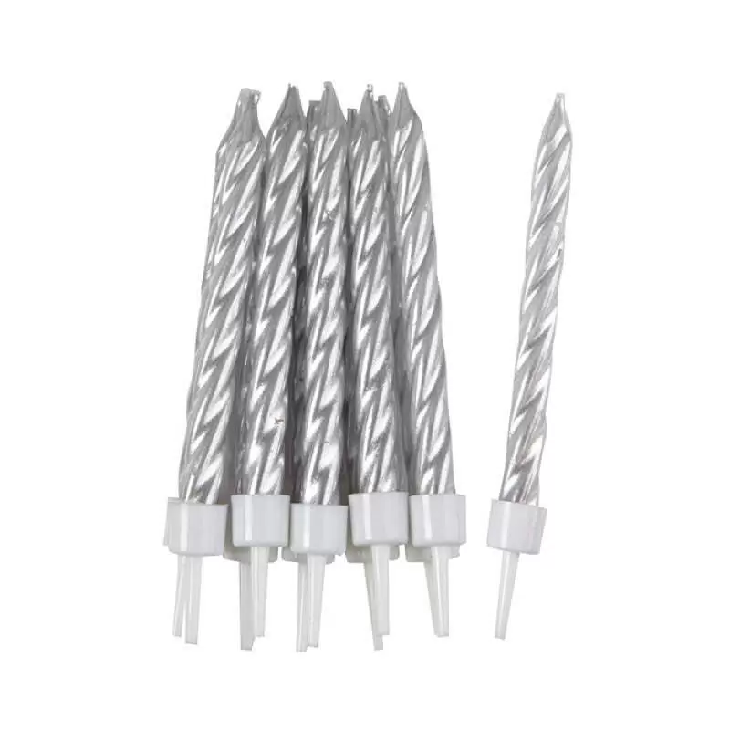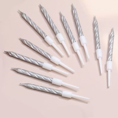 Свечи для украшения интерьера, декорирования тортов любого праздника. В наборе 10 серебристых свечей высотой 5 см. (на подставке)