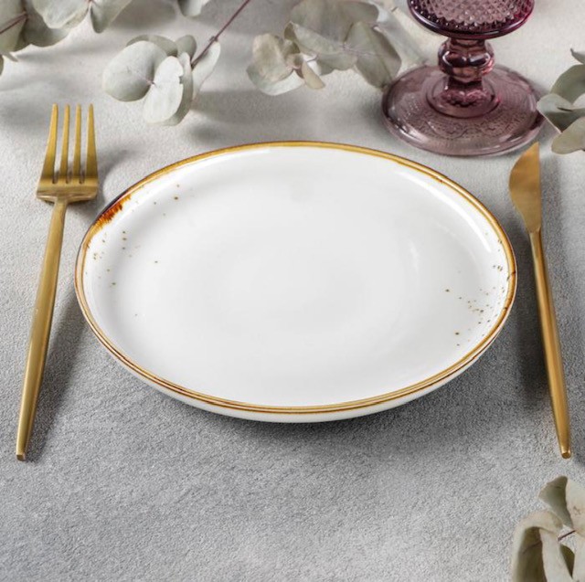 Фарфоровая тарелка строго дизайна с легким декором, универсальный вариант для любого десерта. Прекрасный аксессуар для фудфотографии.