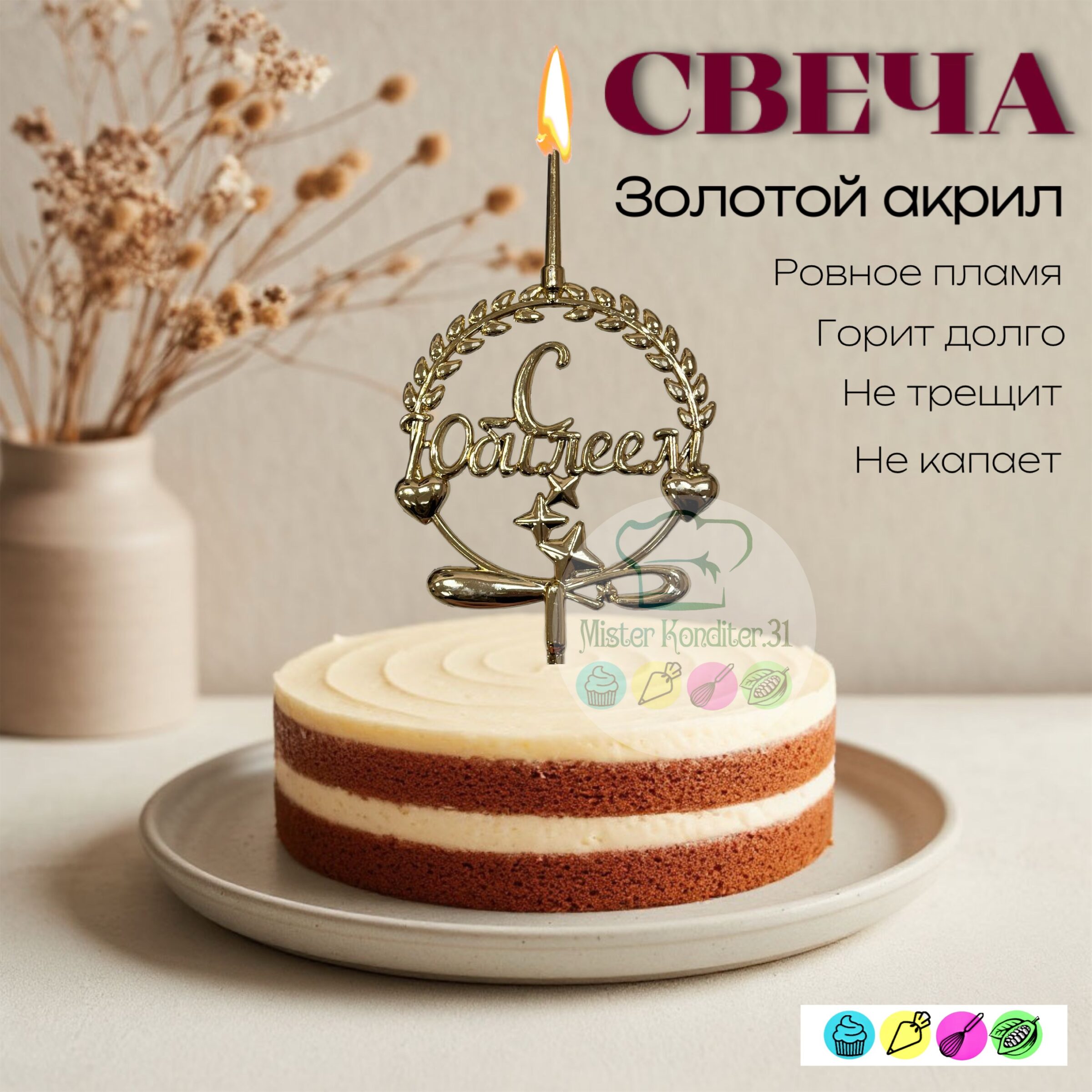 Топпер-свеча объемная «С Юбилеем», золотой акрил