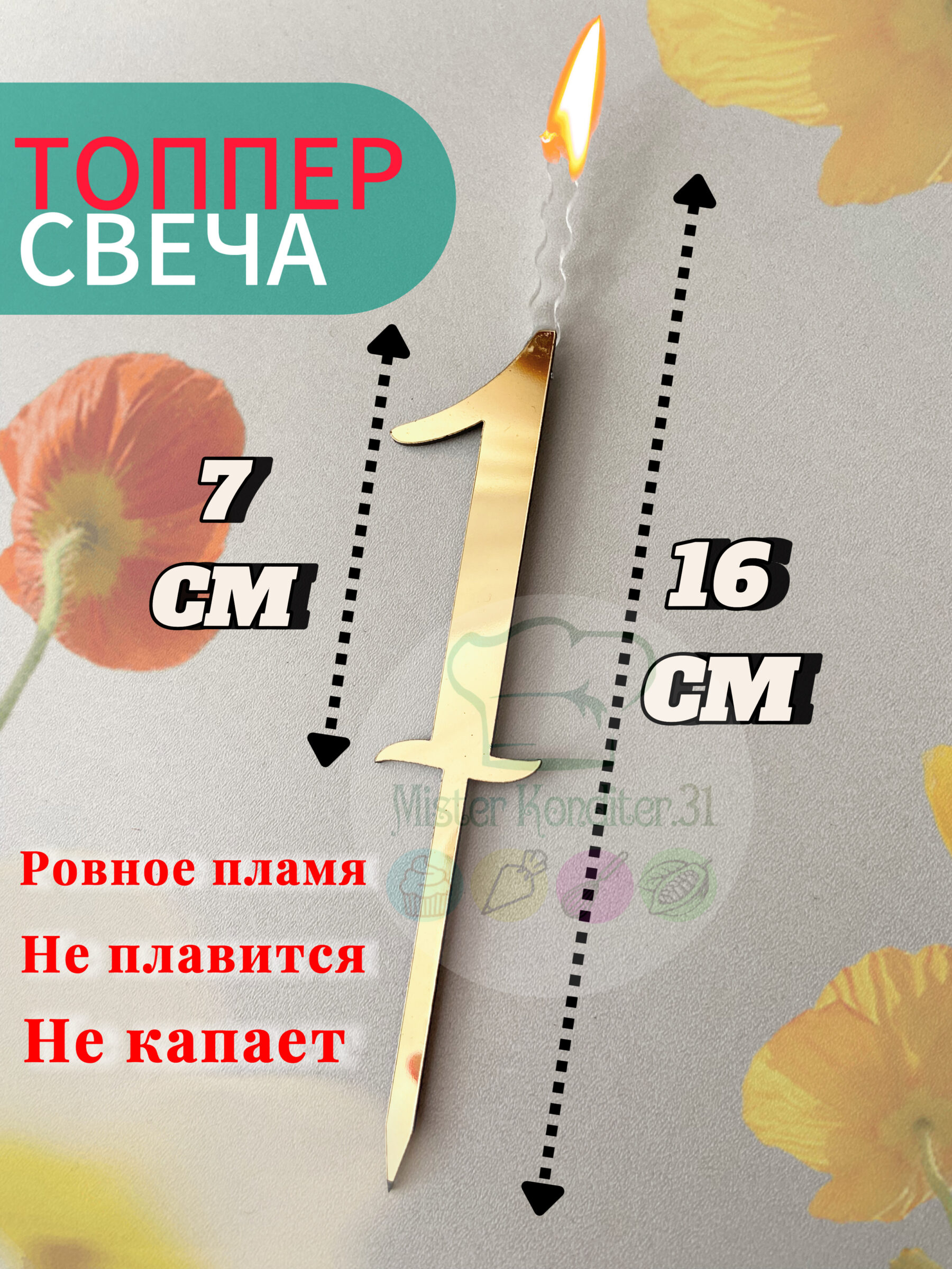 Высота всего изделия 16,7 см. (ножка 5,4 см., цифра 7 см., пламя 4,5 см.)