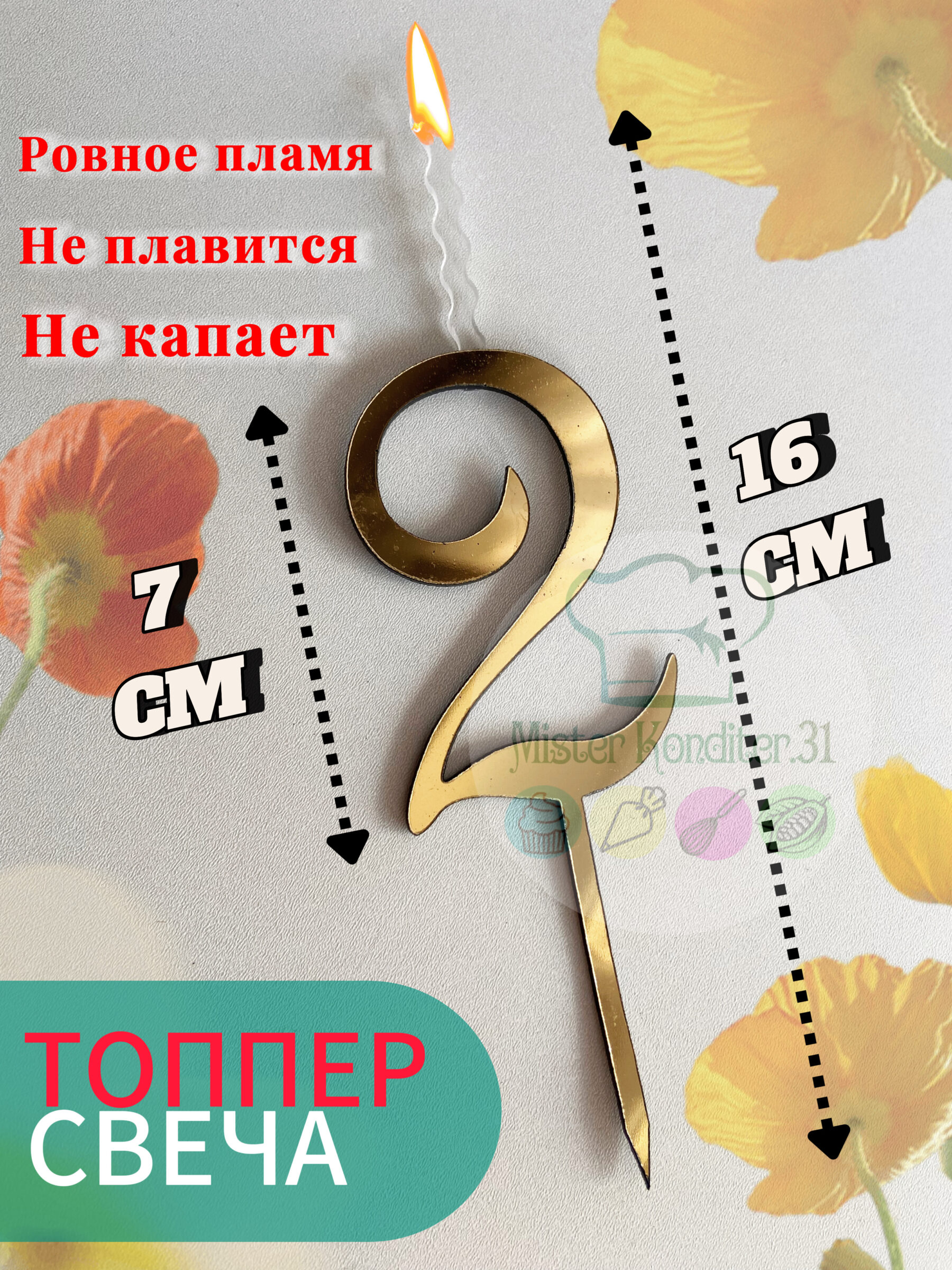 Высота всего изделия 16,7 см. (ножка 5,4 см., цифра 7 см., пламя 4,5 см.)