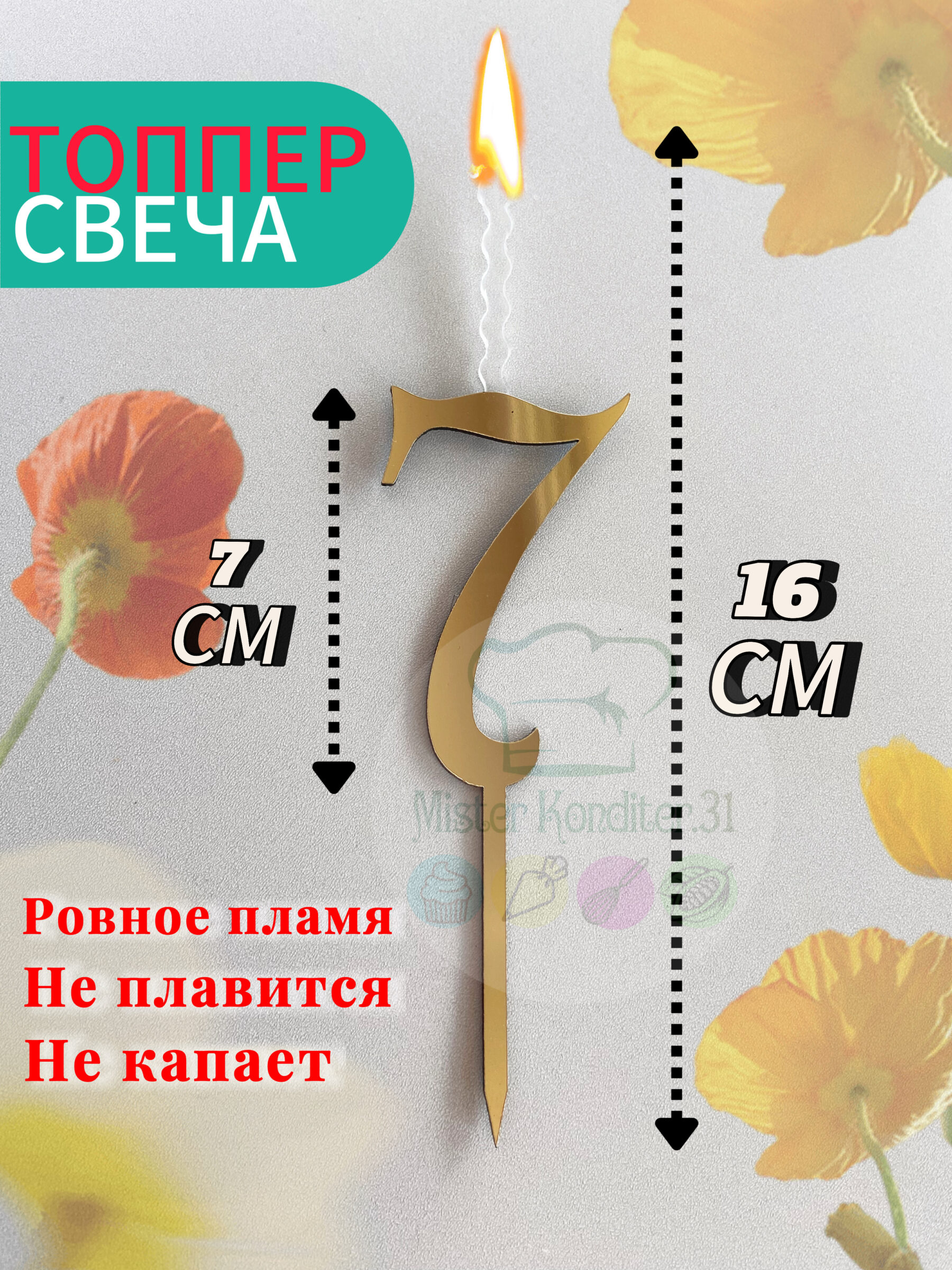 Высота всего изделия 16,7 см. (ножка 5,4 см., цифра 7 см., пламя 4,5 см.)