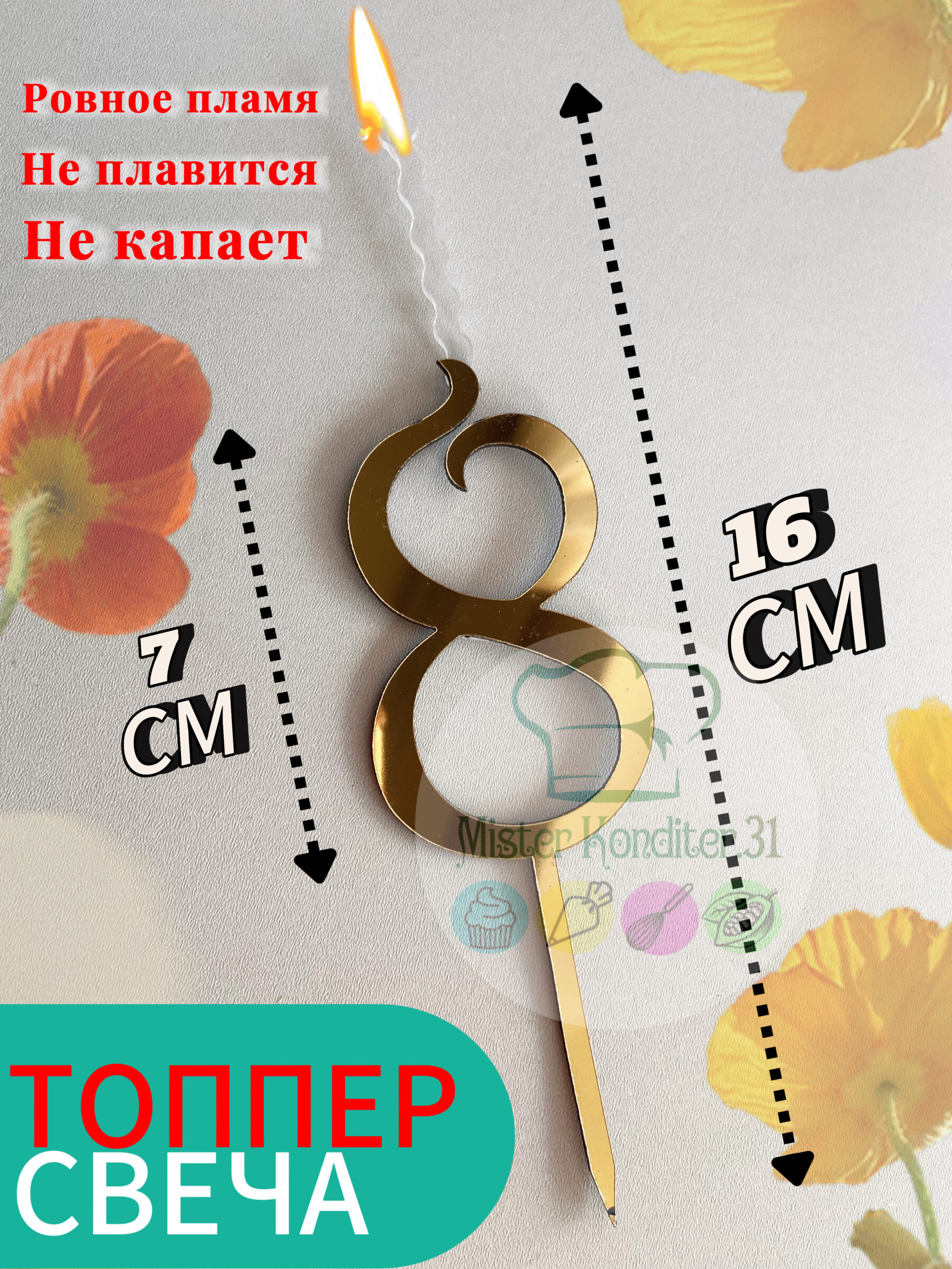 Высота всего изделия 16,7 см. (ножка 5,4 см., цифра 7 см., пламя 4,5 см.)
