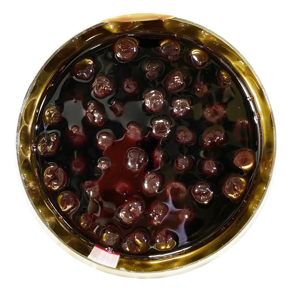 Вишня расфасована в прозрачные контейнеры, в каждом из которых 24-27 крупных ягод, залитых густым сиропом.