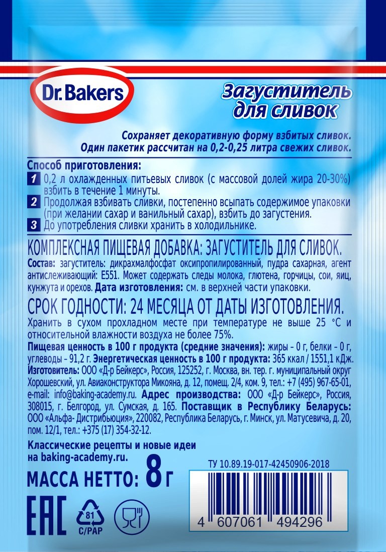 Загуститель Dr.Bakers для сливок, 8г помогает улучшить качественные показатели сливок, взбиваемых с сахарной пудрой до устойчивых пиков, и в течение долгого времени сохраняет декоративную форму взбитых сливок.